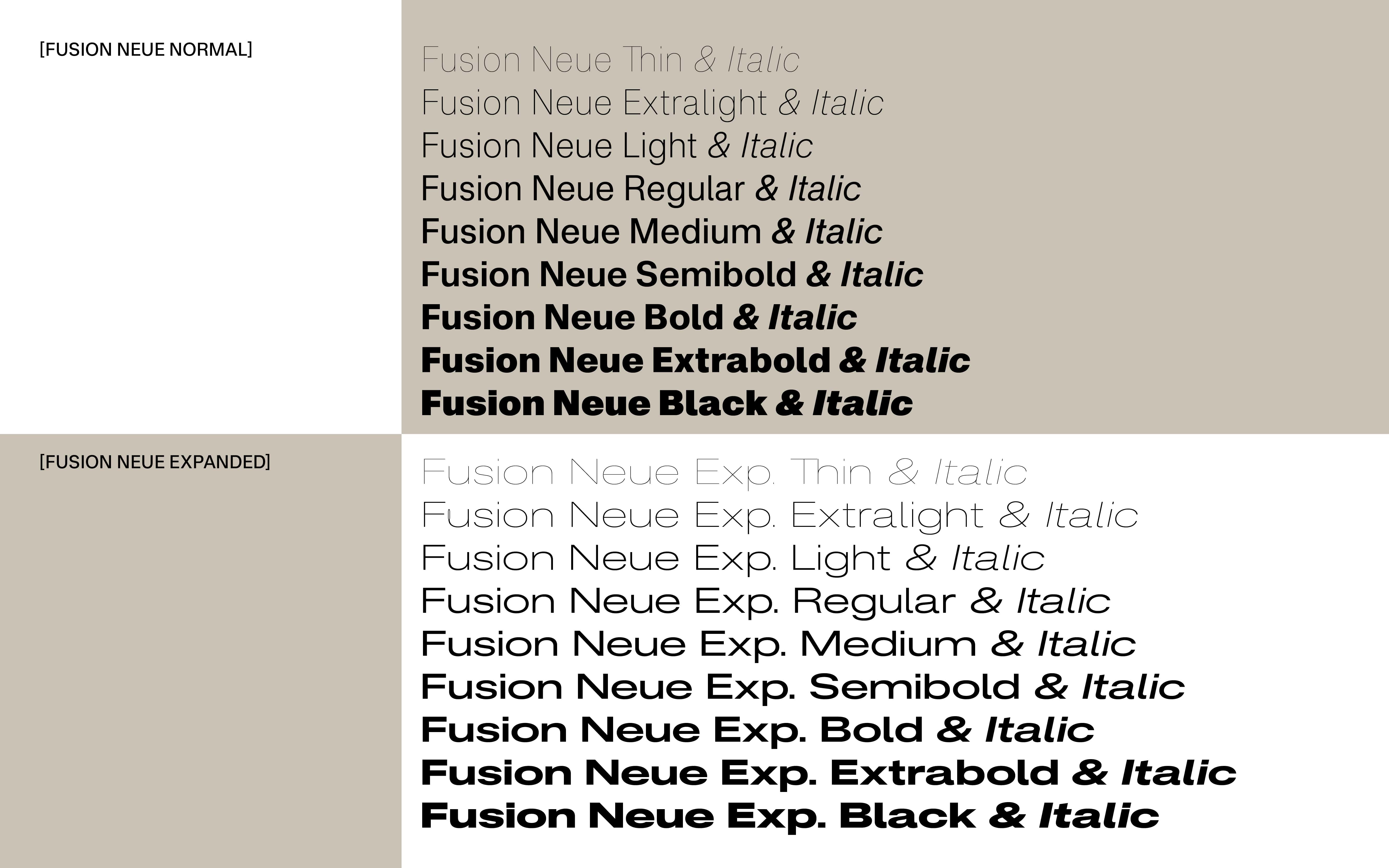 Fusion is the dream of a marriage between the best of post-WWII Swiss typography, a rational yet inspired neo grotesk. To enable this union, the family is separated into 2 entities, Fusion Grotesk and Fusion Neue each offering open or closed endings, as well as a vast selection of alternative glyphs. The set is then completed by 8 weights, 2 chases and its italics.