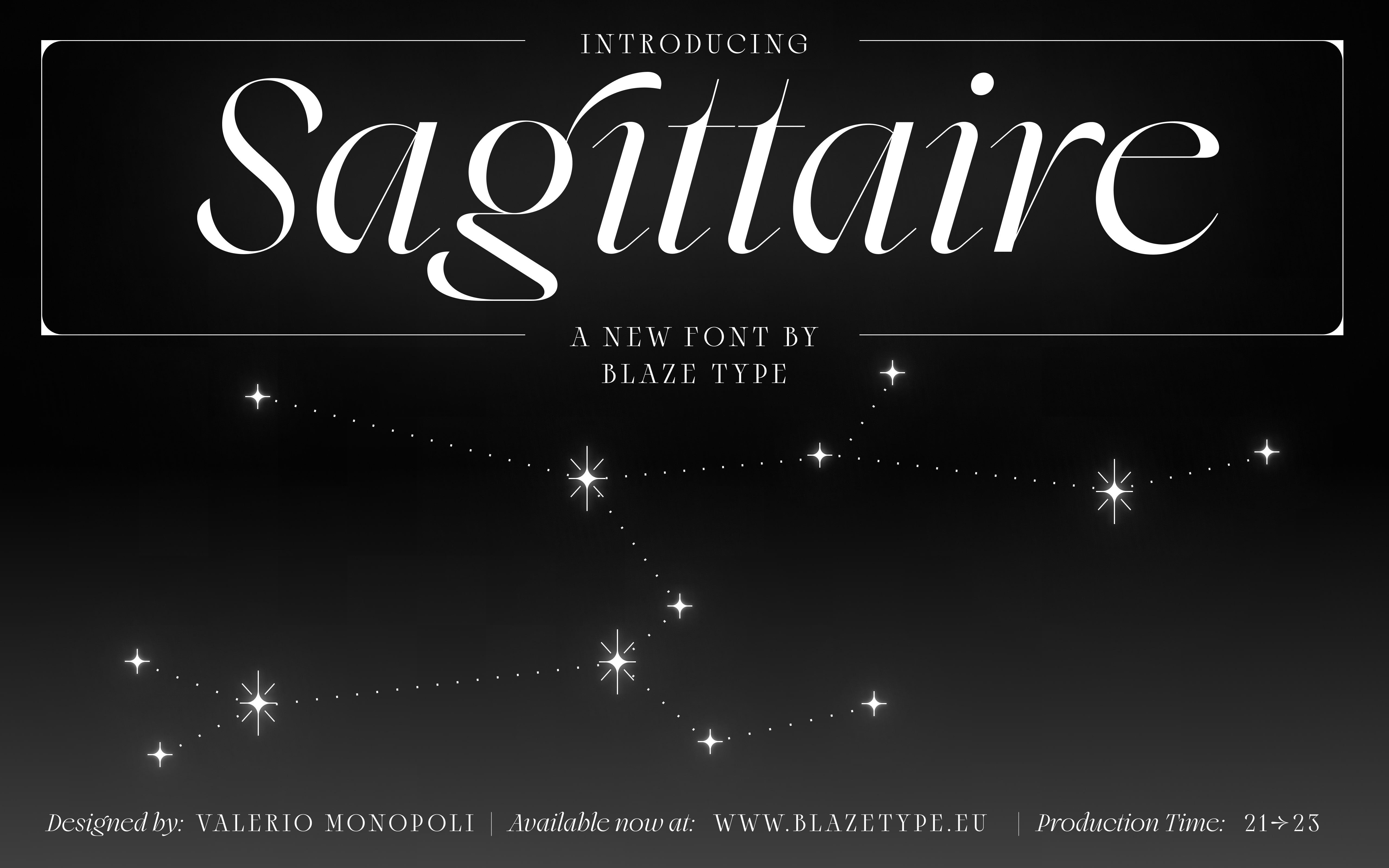 Sagittaire, with its large serifs, striking contrasts and elegance, is as much Italian Baroque chancery calligraphy as it is slightly decadent fin de siècle typography. The 48 fonts are divided into three optical sizes (text, standard, display), 8 weights and italics.