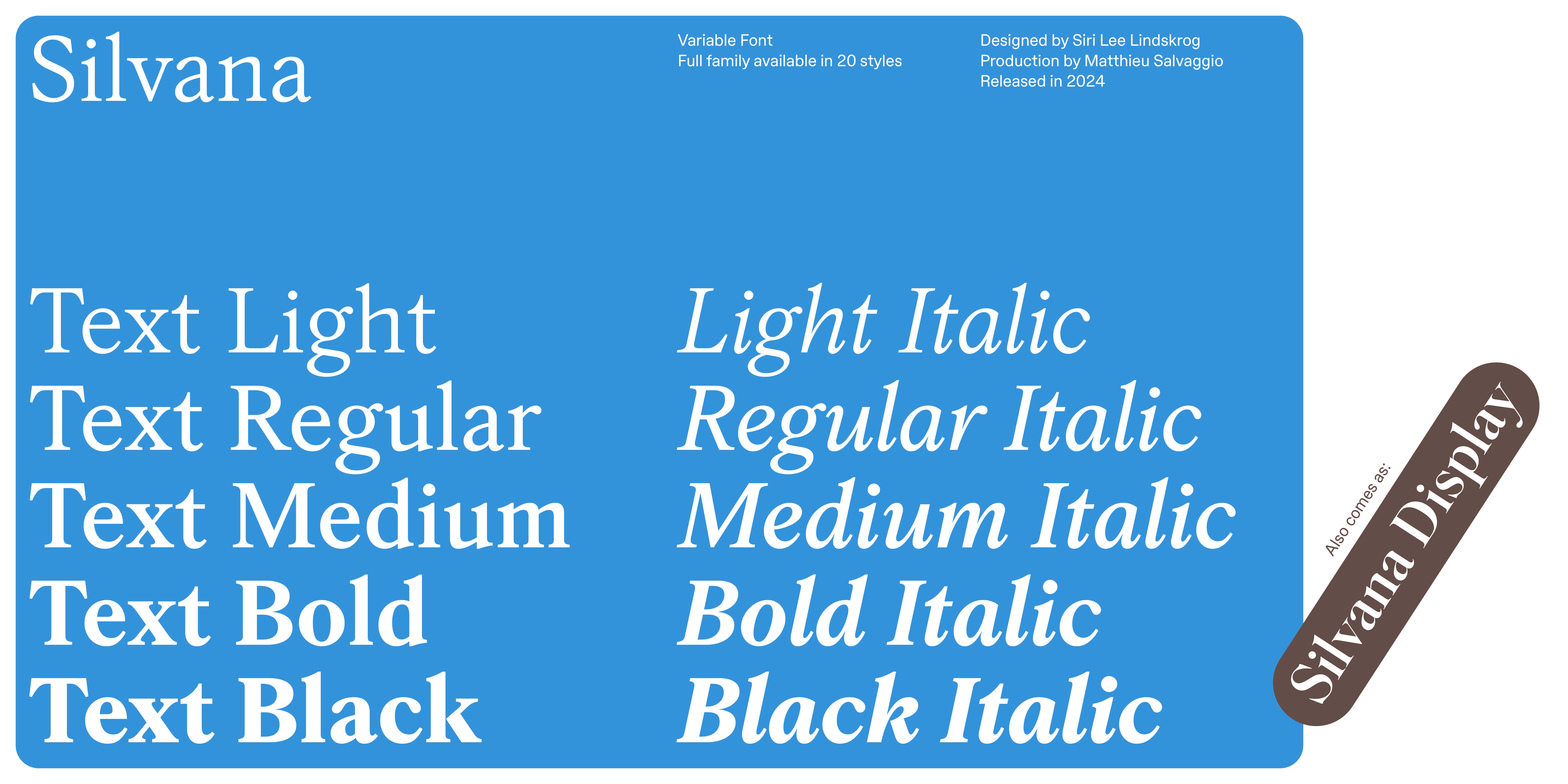 Silvana Text (10 fonts, Siri Lee Lindskrog) is the working text adaptation of its big sister, Silvana Display. The work involved not just an optical adaptation, but a complete overhaul of the design, the old-fashioned way, glyph by glyph.