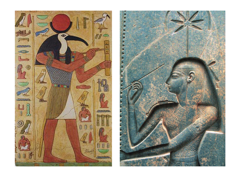 Egypt, the second great ancient civilization, inherited the discoveries of the Mesopotamians: agriculture, animal husbandry, but also diplomatic practices, notably with the use of seals. Thoth, the god with the face of an ibis, represents divine intelligence and embodies the word. Under the figure of the moon, he is also the god of healers and magicians, that is to say of divine practices reserved for the initiated. As such, he is also master of all the arts, of speech, of the sciences of numbers and signs. At the crossroads of disciplines, he is also the god of writing and notes, as a scribe, the results of the weighing of the soul of the deceased. More than a creative god, he embodies the word of the creative god.