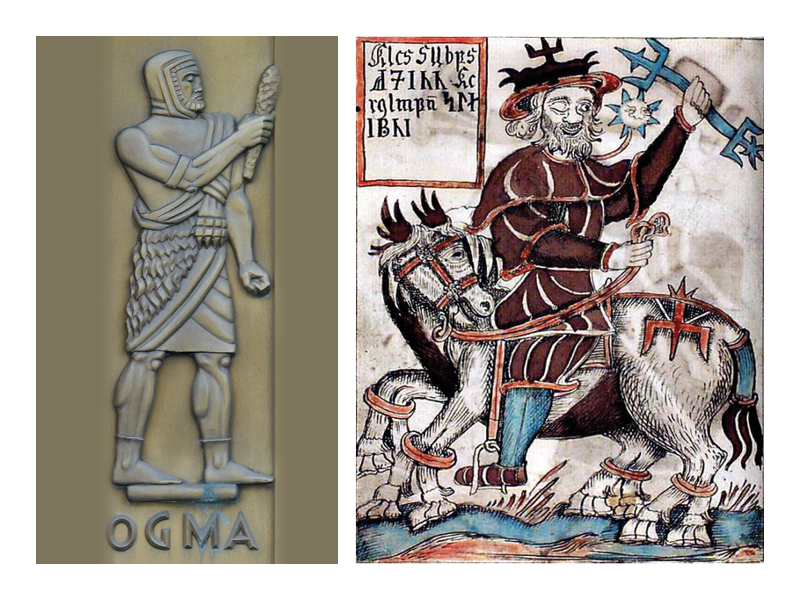 In Irish and Scottish mythology, the god Ogma (Ogmios among the Gallic Celts) is the inventor of oghams, the Gaelic script. His name refers to engraving, i.e. the method of tracing these signs in wood or stone.