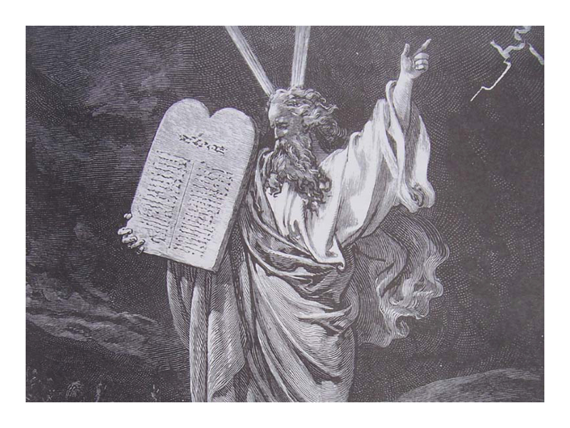 Among the Jewish people, God traces the characters of the Tables of the Law with a finger of fire. But after Moses' anger at the idolatry of the faithful, he broke the Tables and decided to rewrite them under divine dictation, according to his memories of the divine writing.
