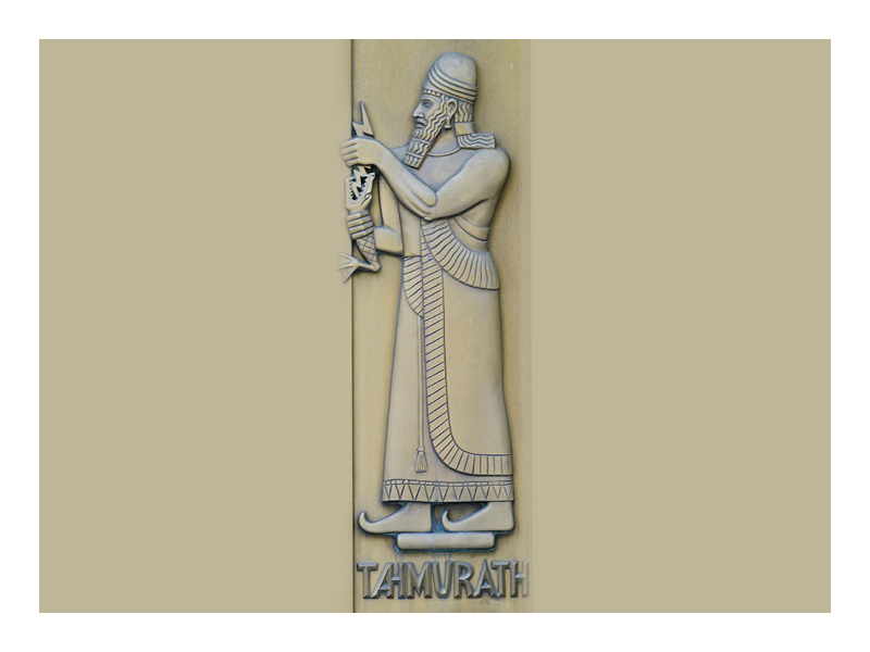 Tahmuras is the third Shah of the Pichidian dynasty according to Iranian mythology. After making the deevs (demonic creatures) his slaves through magic and strength, they taught him the art of more than thirty different scripts. However, he is also the inventor of looms, good fodder management as well as the domestication of chickens, hunting dogs and falcons.