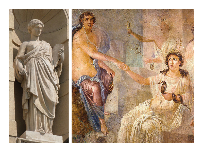 Writing is not only a system of signs, it is also an artistic practice and the different forms of creative writing are well represented in the Greek pantheon. The Muses represent the arts, and some of them have objects that clearly show their links with writing. Calliope, the muse of epic poetry, has a tablet and a stylus as her attributes. Clio, the muse of history, carries books and scrolls of parchment. The other literary forms, erotic poetry, lyric poetry, tragedy, hymns or comedies, are detached from the written medium.