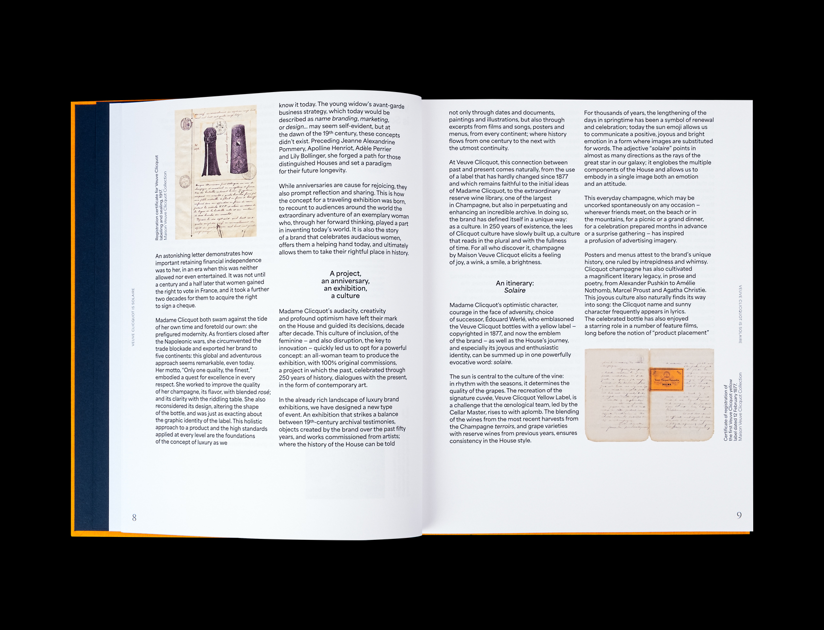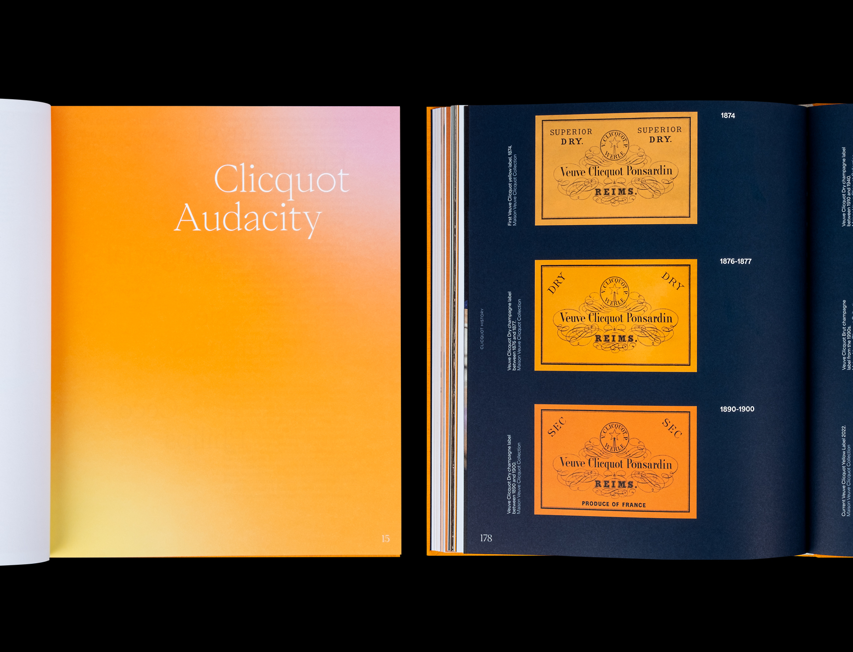 As a general rule, we like to use typefaces in pairs as contrasts, mirrors or counterpoints. For example, the brutality of Surt was very appropriate in relation to the elegant, robust typography of Jérome Knebusch (Almost typeface at Poem). For the exhibition and catalog celebrating 250 years of Veuve Clicquot champagnes, we used Area in body text and caption to counterbalance the titles and caps in Eiko (Pangram Pangram).Â