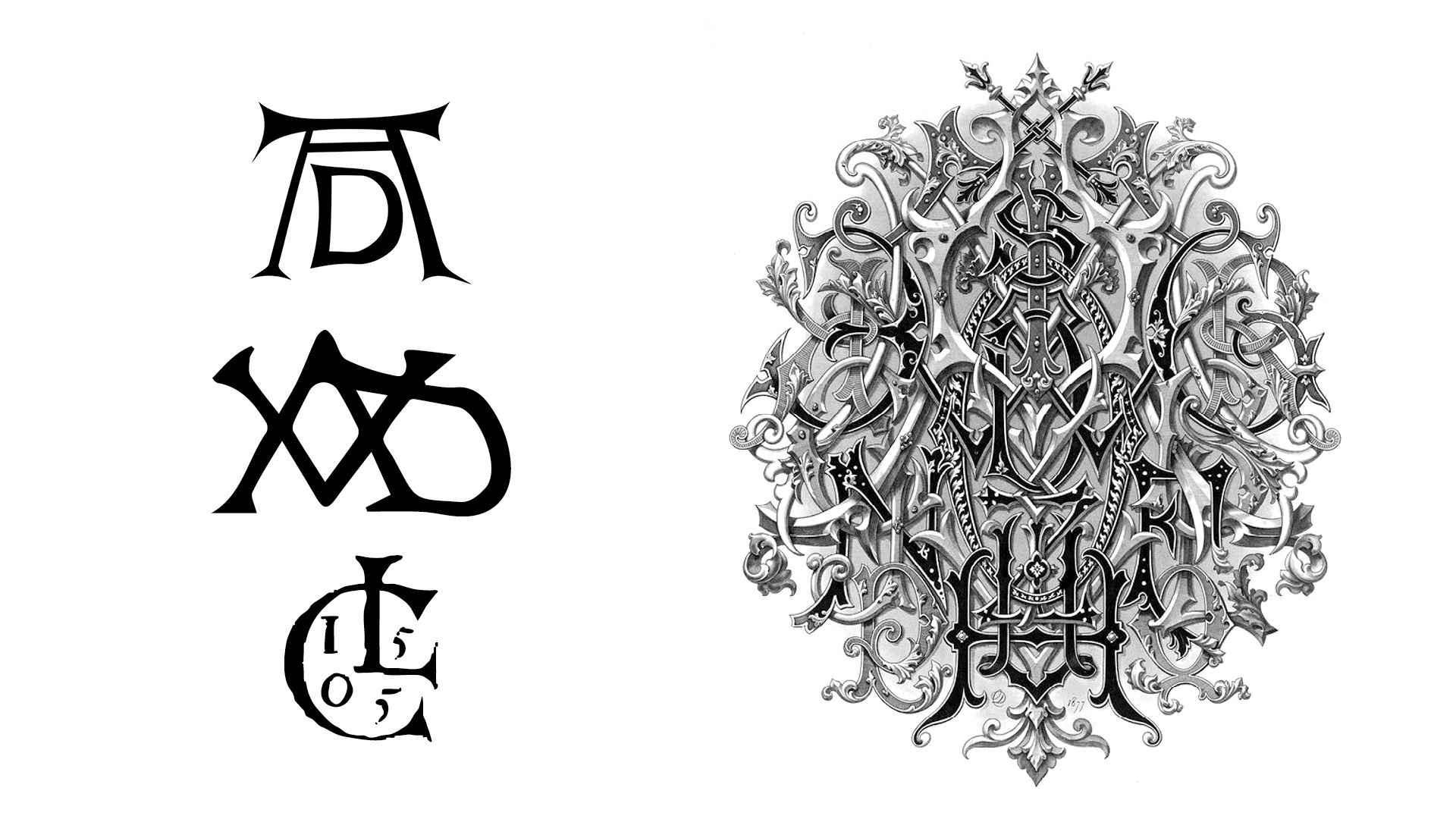 Modern ligature for artists signatures (Albrecht Durer, Anton Van Dyck, Lucas Cranach), and a pangram monogram by Demengeot, 1881.
