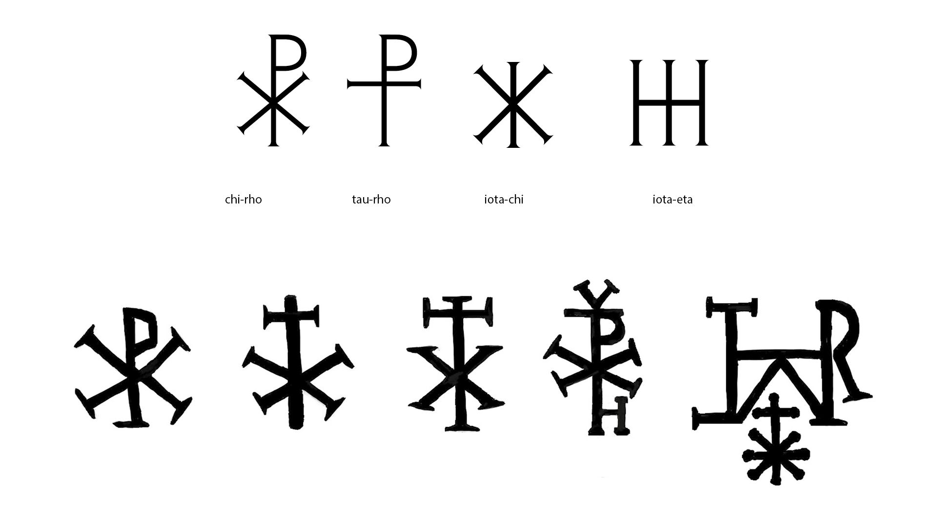 The first Christians used monograms for a very different purpose from the Greeks. Like the Greeks, the Christian monogram uses the initial, terminal and sometimes medial letters of a word to contract it, with the superscribed stroke attesting to this role. But it's also based on the Hebrew tetragrammaton YHWH, symbolizing the name of God.