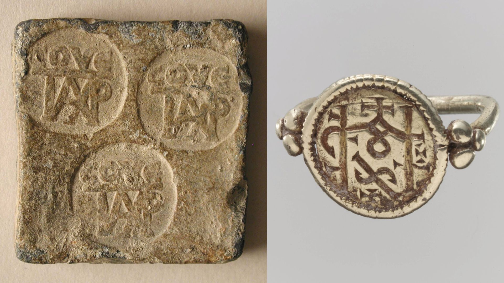 Antiquite monogram on lead ingot ("city eparchy", 6th century, 80 g). Merovingian ring in electrum (mix of gold and silver), 7th century, north of France.