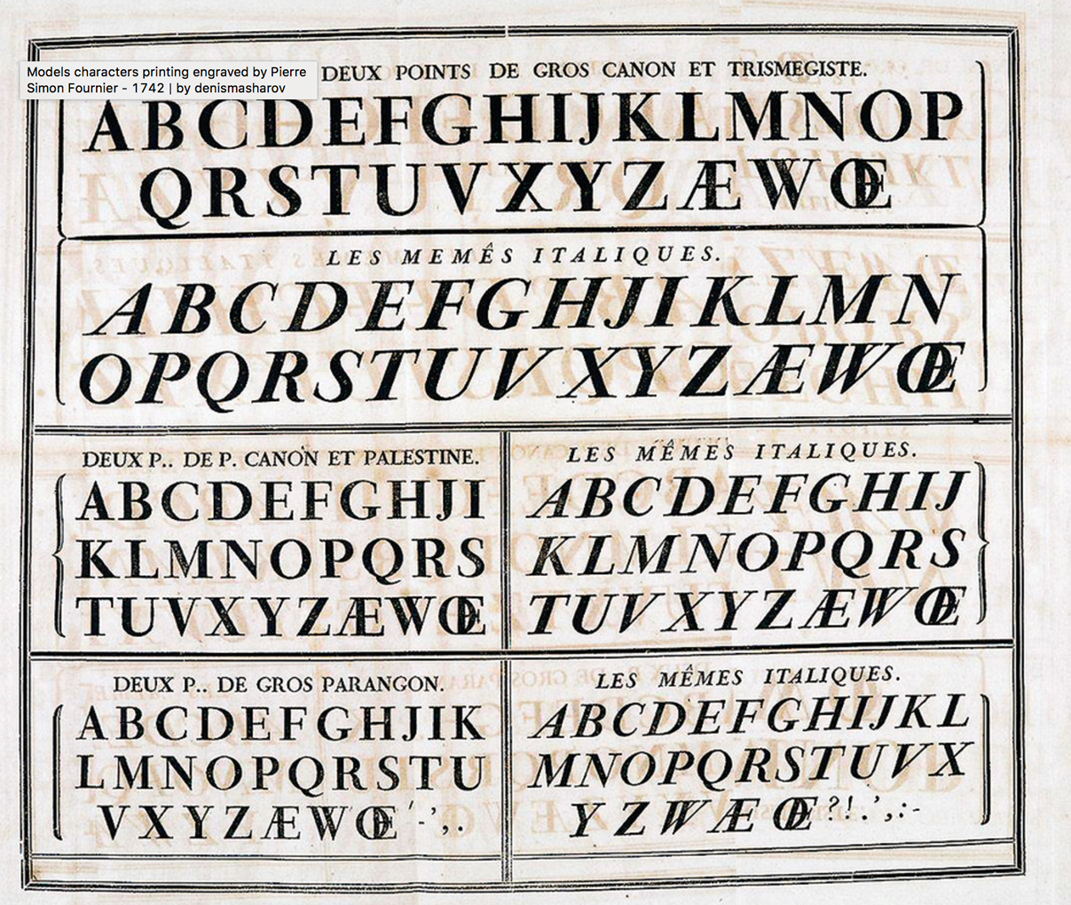 France is still one of the countries at the forefront of typographic reforms, thanks in particular to Pierre Simon Fournier le Jeune. The latter is the inventor of a measurement system corresponding to the current typographic point, but also one of the first to conceive his alphabets as a whole: the various sizes, the roman and the italic, ornate letters, but also a script, borders, vignettes and ornaments are included. The overall harmony is thought out in advance in order to design the book according to a set of appropriate tools.