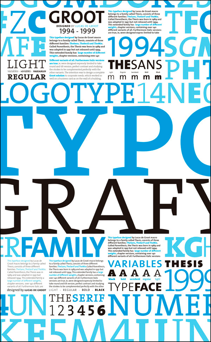 In response to Emigre, the guardians of the modernist tradition respond with projects in which the computer perfects what Frutiger imagined to be done by hand. Through a game of interpolations between styles, the designer obtains the intermediate nuances. A family composed of a light, a normal and a black, allows to obtain thanks to the Multiple Master technology a vast panoply covering the intermediate weights. The case of Lucas de Groot's Thesis is the demonstration of such a philosophy. Conceived between 1994 and 1999, the family is deployed on a vast set of styles: TheSans and its variants Mono and Typewriter (33 styles), TheSans SemiCondensed (16 styles), TheSans Condensed (16 styles), TheSerif (16 styles, then again 32 styles for the SemiCondensed and Condensed), and TheMix (64 styles in total). In the end, the family includes 177 children, to which we must add the style variants offered by TheAntiqua and TheStencil.
