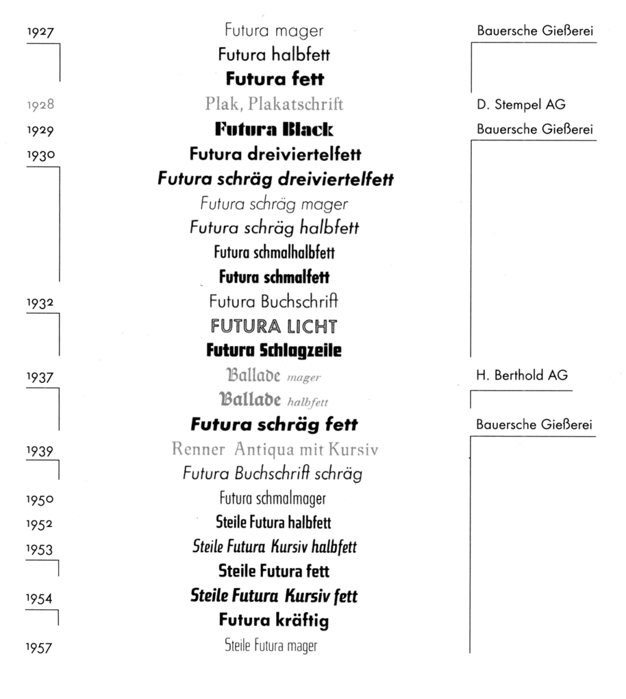 It is difficult to know the reasons for this typographic expansion. The success of the typeface in Germany, in Europe and then throughout the world established Futura as a trademark (protected in 1953) and attracted the attention of the profession, which was then affected by an international crisis. As a proof, the Steile Futura, although designed by Renner, is totally foreign to Futura, so that it is known under other names abroad: Bauer Topic for the UK and the USA, Vox in Spain, and finally Zénith in France.