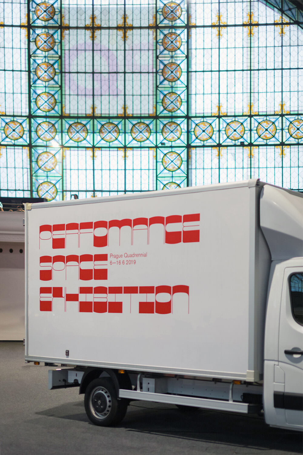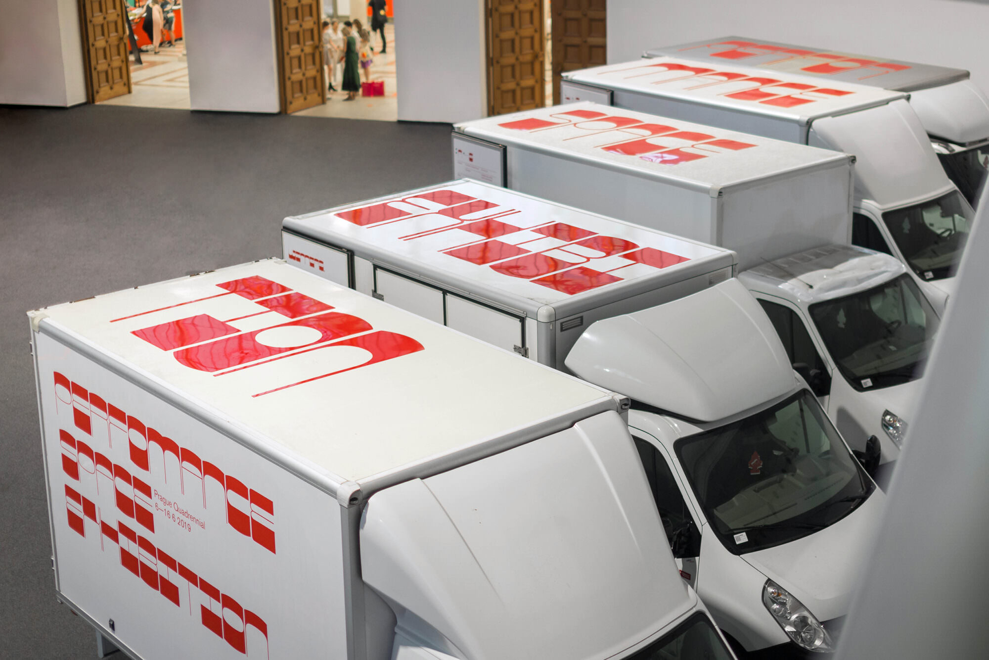 A group of five white trucks is parked in the monumental VýstaviÅ”tÄ Praha HoleÅ”ovice ā Central Hall of the Industrial Palace in Prague. Usually this is the kind of vehicle that transports works of art to an exhibition. Here, as a part of theĀ Prague Quadrennial, the trucks themselves are the exhibition space.