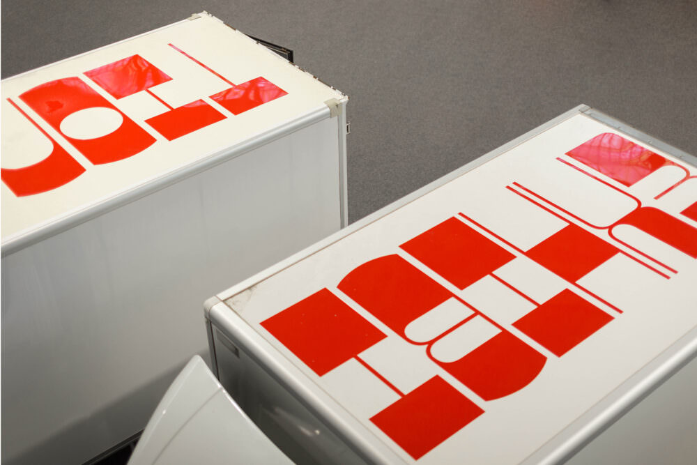 Inside, loading space is repurposed as display cabinet and cinema; on the outside, designersĀ MatÄj ÄinÄeraĀ andĀ Jan KlossĀ left no possibility unused to brand the vehicles with vibrant red typography. From the installation art itself and the type on the roof to number plates and the obligatory Wondertree air freshener: the high contrastĀ ZooĀ (designed by Quentin Coulombier and available from Blaze Type) is used throughout. Its offbeat shapes are counterbalanced by straightforward typography with programme information, usingĀ Akzidenz-Grotesk.