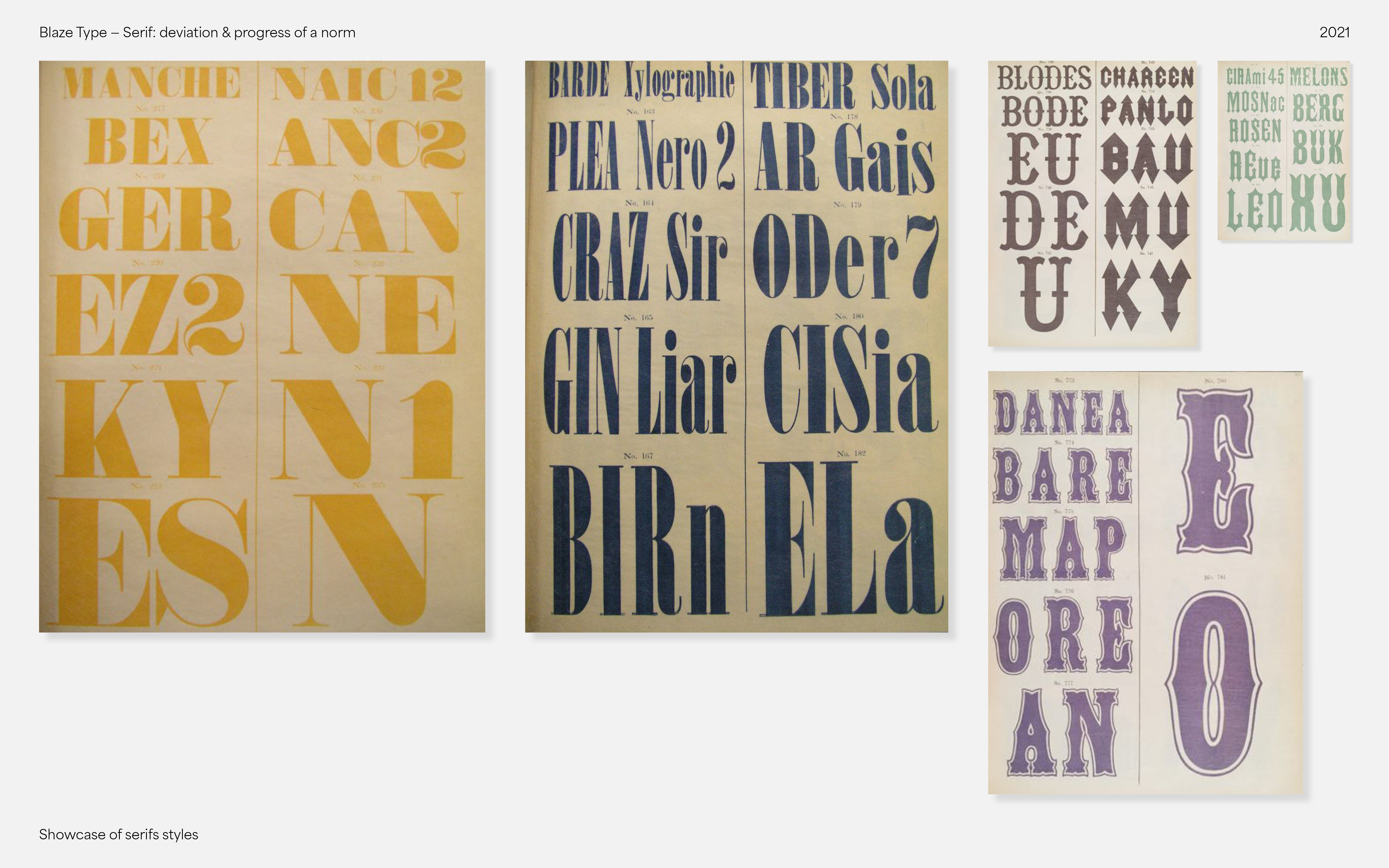 Since the Industrial Revolution, type design is no longer a matter of fine art craftsmanship. Lithography allows artists to include lettering within the illustrations, creating a unique style of composition, but also monstrous letters. The appearance of industry, as well as democracy, create new needs for newspapers, posters, labels, stationery, wrapping papers, etc. Printers began to include creation studios in order to offer quality, both in conception and production. Being able to offer new modern typefaces was the first step to be identified as a better manufacturer than the concurrent when the machines and the workers were mostly the same. Type foundries appeared in the mid of the XIXth century as creative studios offering the weirdest type explorations. Serifs could be shaped with a very traditional approach, a radical evolution or a teratological phenomena: monsters everywhere in the Barnum of early Modernity.