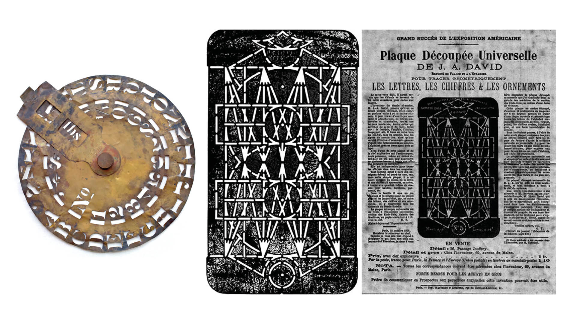 In 1870, the universal engraved plate (J.A. David) enabled lettering to be prepared using a stencil containing all the glyphs on a single metal plate. This advanced normograph was marketed in France and the USA at the Paris Universal Exhibition in 1878.