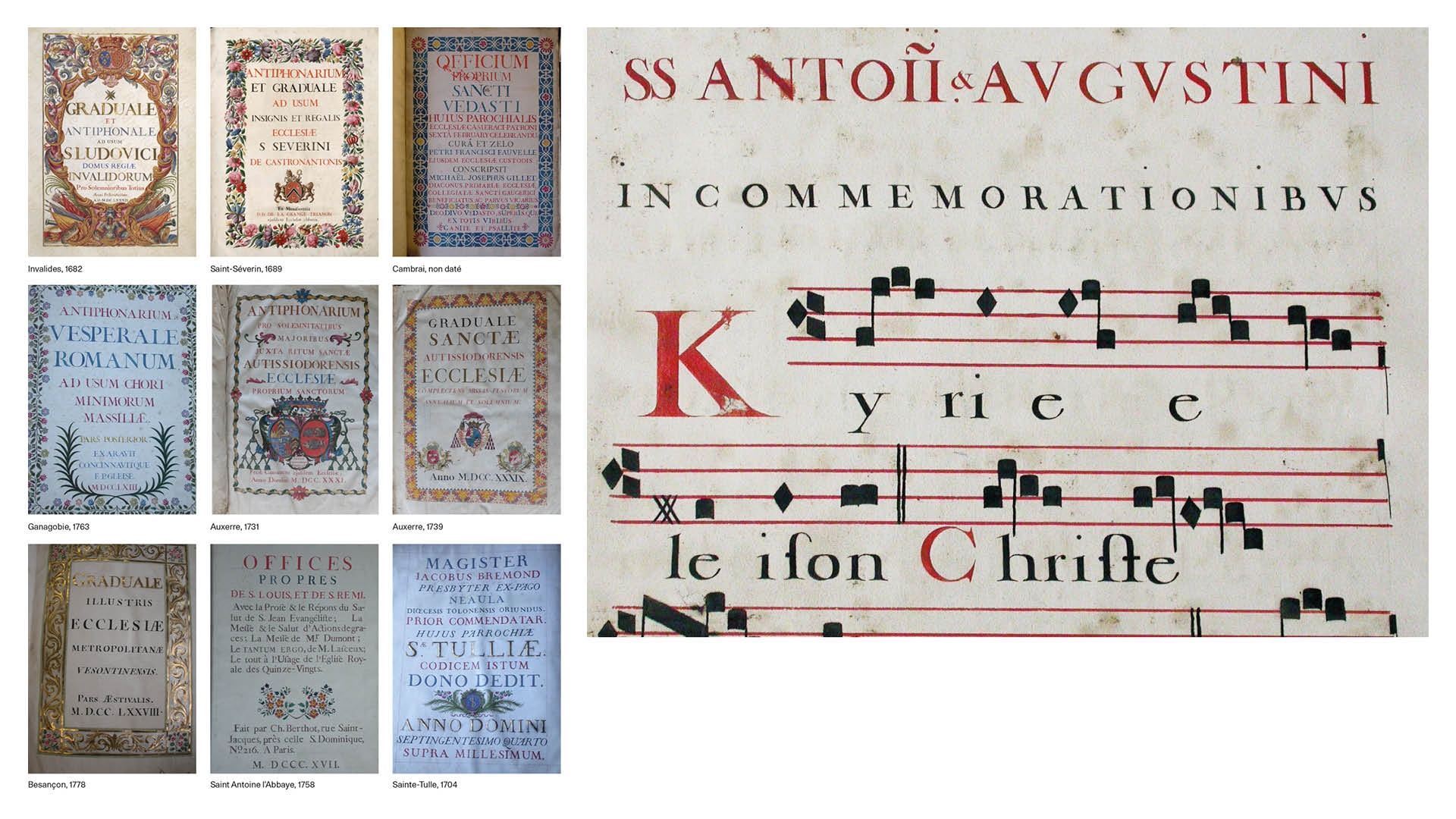 Stencilled wall ornaments and textiles probably lasted beyond the medieval period. However, it wasn't until the mid-17th century that stencilled texts came to light. Numerous French and German liturgical chant books, known as "livres de chœur", were displayed on a lectern during mass. The exceptional nature of such editions, with their monumental format (80 by 110 cm), their weight (up to 30 kg) and their content specific to a place of worship, implies a unique manufacturing process. While calligraphy is time-consuming and its artists rarer, stencil printing appears to be a compromise between writing and letterpress printing. The final result is highly precise, even if breaks in the letters have to be retouched with a pen to respect the usual appearance of the glyphs. However, the trend is moving towards a form of tolerance, and these shortcomings are no longer filled in, probably for reasons of cost and time.