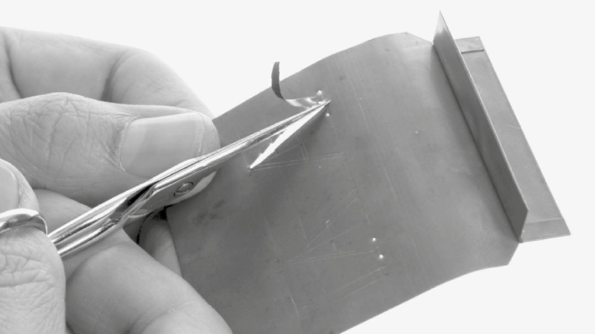 The glyph design is transferred to the metal plate with a metal tip, then cut out with a pair of scissors. The edges are then trimmed and polished to refine its contours.