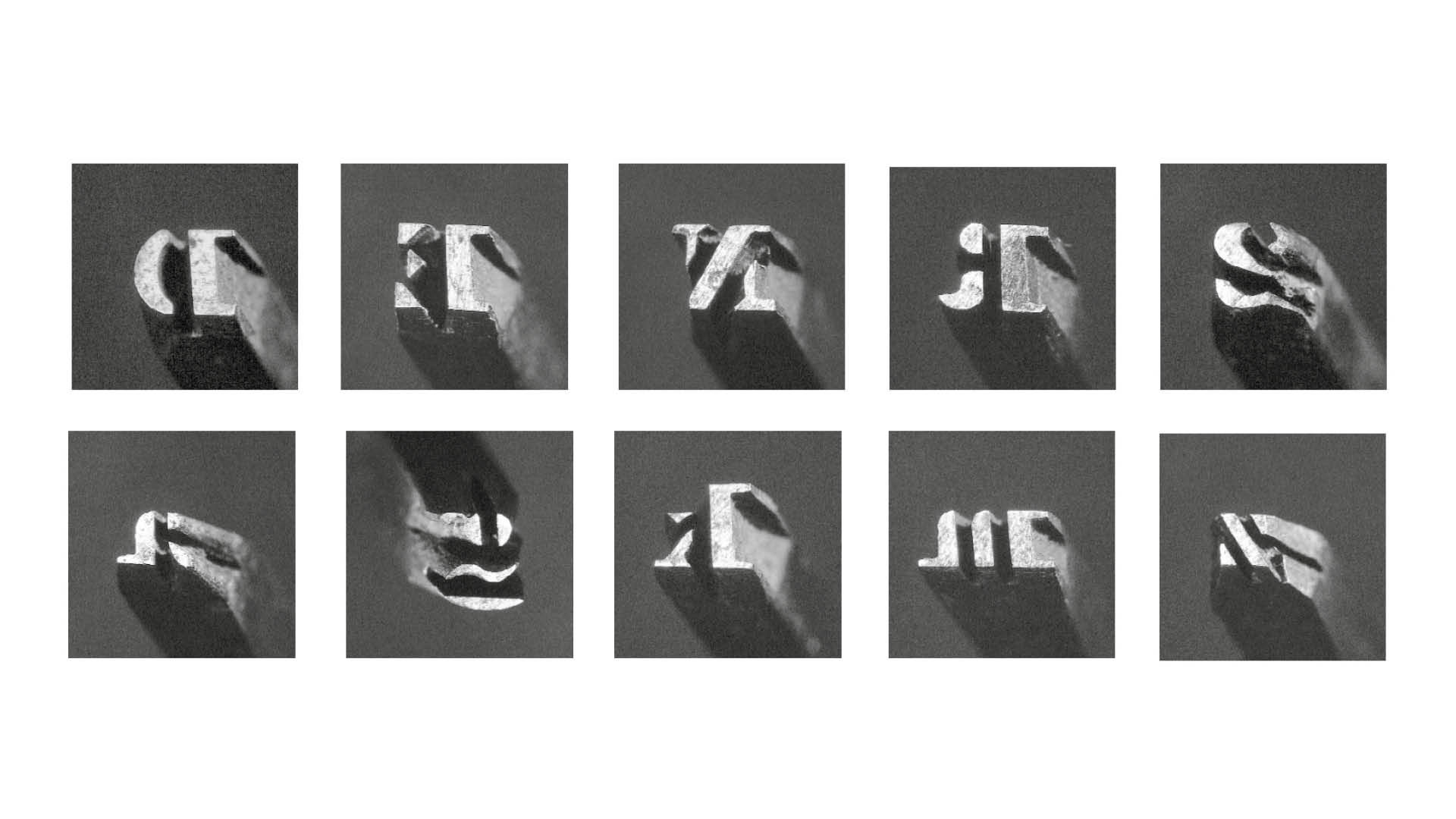Small stencil specimens highlight a more precise technique. The glyph design is transferred to the metal plate, which is then covered with a protective varnish, except for the shape of the glyph. Thus protected, the plate is dipped in an acid bath and the etching process, similar to that used by art engravers, allows the plate to be perforated. Here, the aim is not to deliver one typeface per plate, but to create a matrix for a complete layout. In this way, reproduction of a business card or bookplate in multiple copies is made easy, fast and possible on demand.