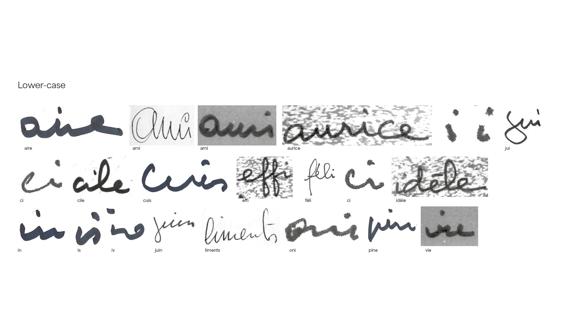The first step in production will be to select the models for each lowercase glyph and vectorize them accurately. The first tests are designed to check whether the resulting rhythm is close to the handwriting.