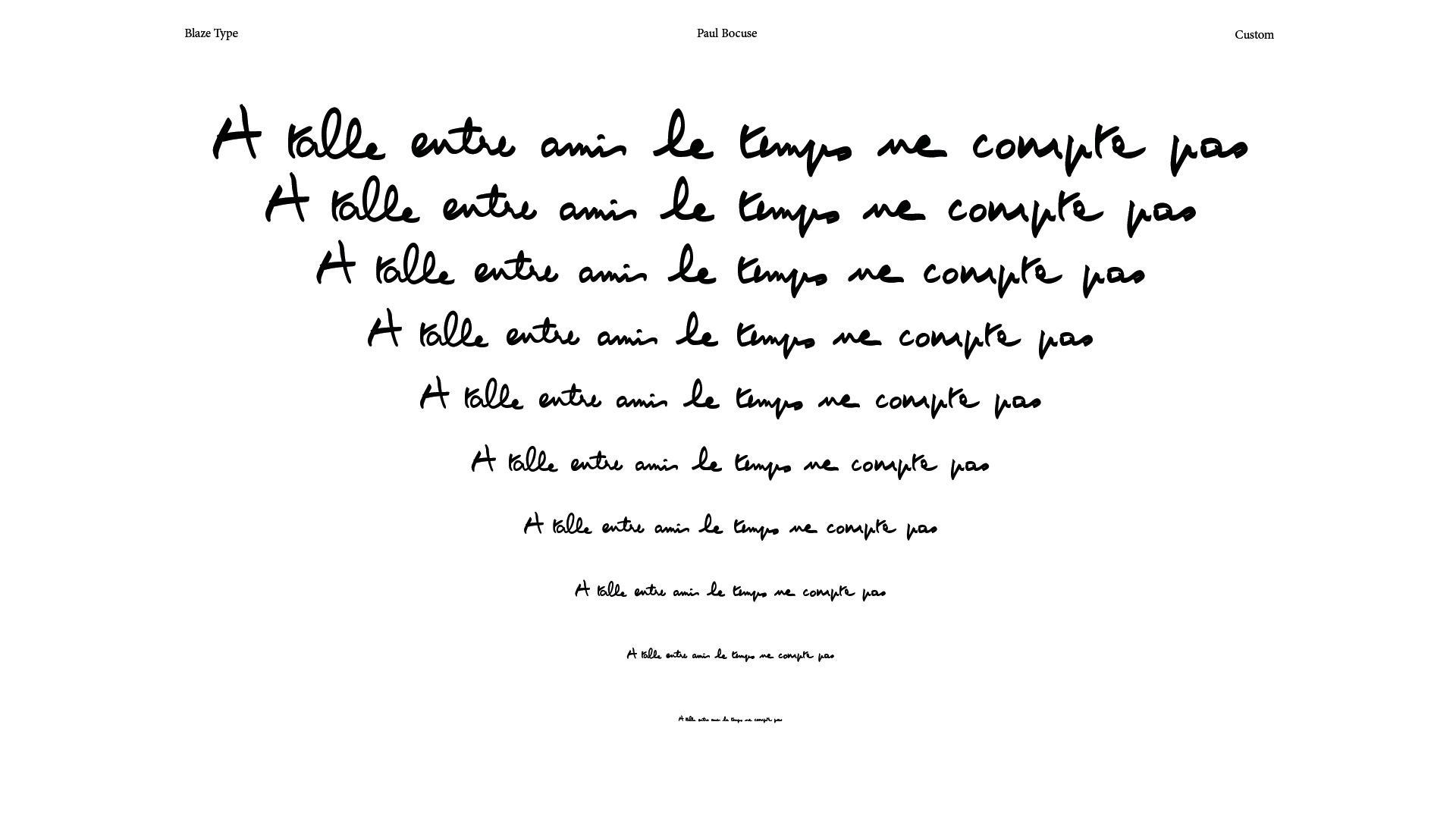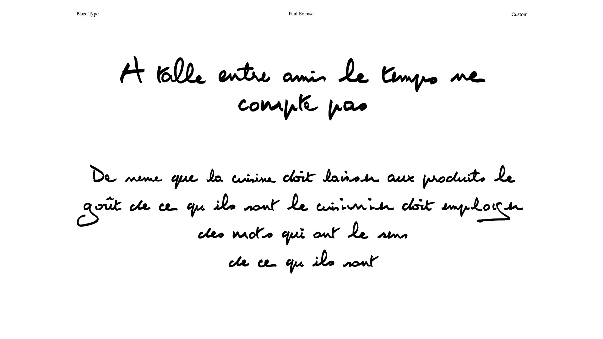 Paul Bocuse's handwriting will never be calligraphic, no matter how hard he works on his strokes and the rhythm of his ligatures, or how much he bevels the tip of his marker. However, this typography must remain in its place: a craftsman's job, where the designer's know-how is to design a tool that is easy to use and capable of bringing life back to the hands of those who are no longer here. In the work of a manual revival, the designer's modesty makes it possible to achieve a project where the transparency of the result goes beyond questions of style, far from the polemics of Massimo Vignelli. Everyone is entitled to their own style.