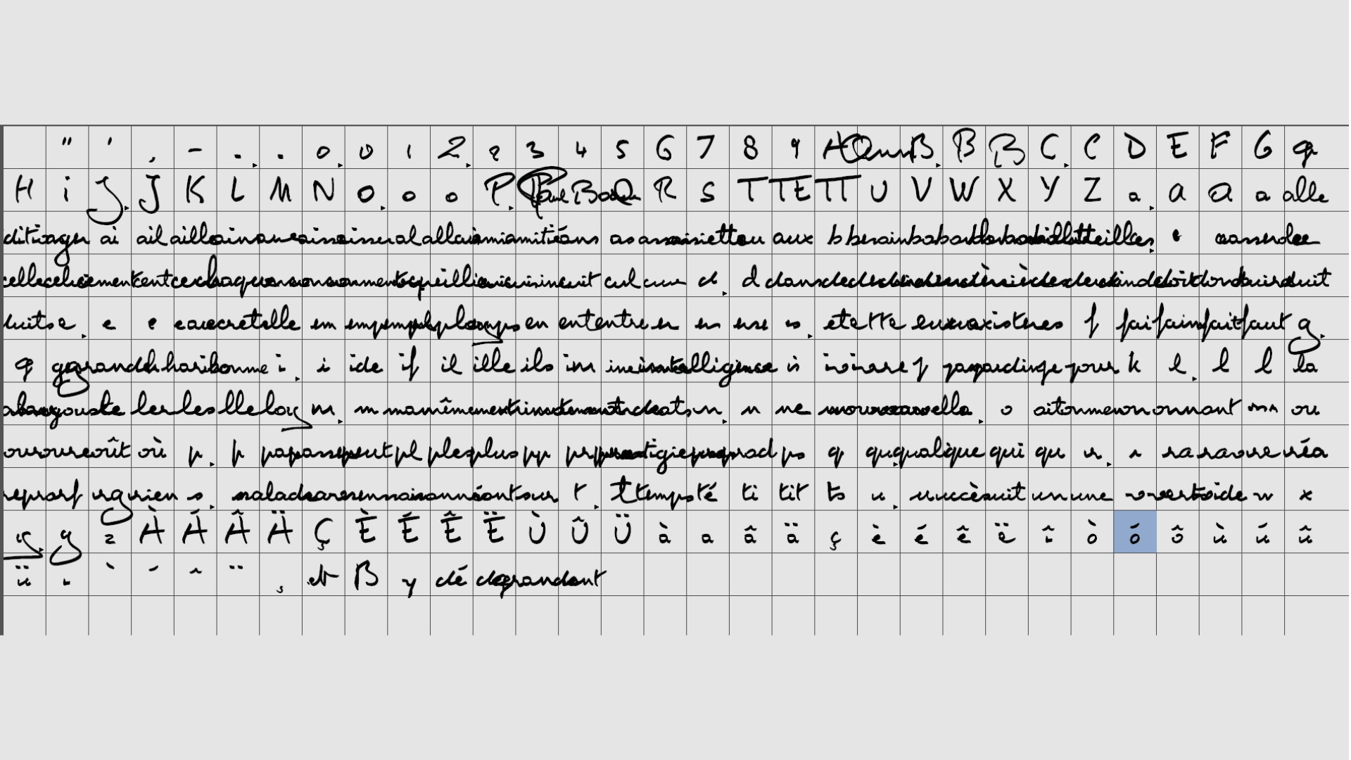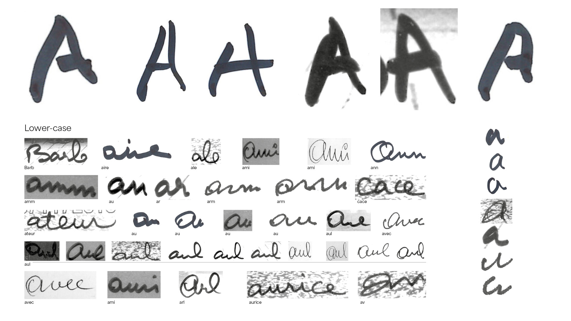 Resuming work requires polishing the lowercase and then the uppercase. These glyphs have a legible morphology, with occasional slur lines, missing letters and a unique character set. Once the set is stable, tests quickly show that certain recurring digrams in French (le, la, de, ts, as, es, etc.) require the design of ligatures. This task is also an opportunity to propose alternative shapes for the letters: the open e is replaced in the ligatures by a plugged or slightly inclined e; the loops of the b or l can also vary in height, for example.
