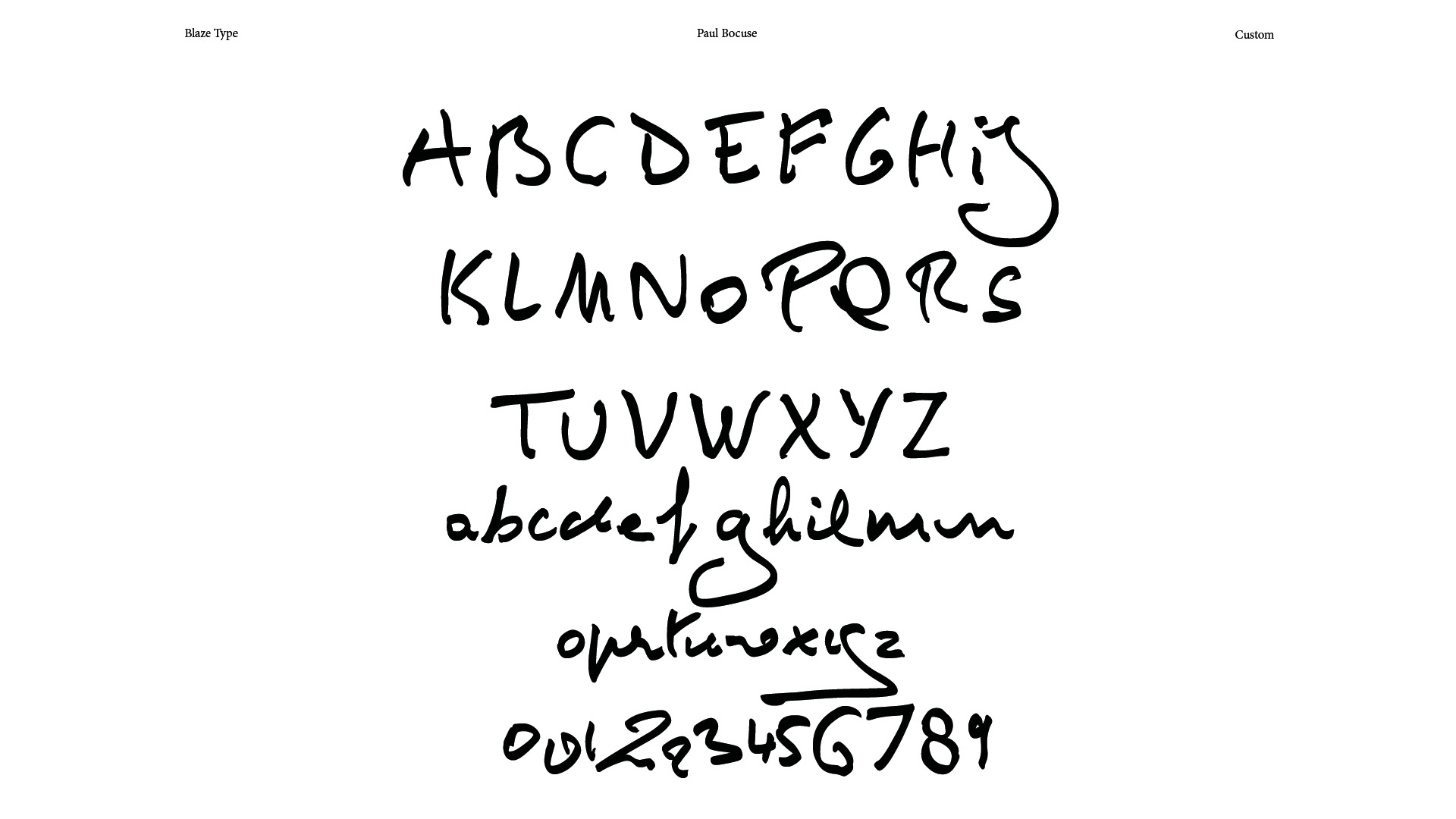 Blaze Type had access to some of Paul Bocuse's handwritten archives in order to digitize and select models for each glyph. 420 images were cut to cover the capitals, lowercase letters and numbers required for a basic glyphset. Some glyphs, such as K, k, j, Q, q, V, X, Y, Z, z, and 8, are still missing from this abundant and sparse documentation.