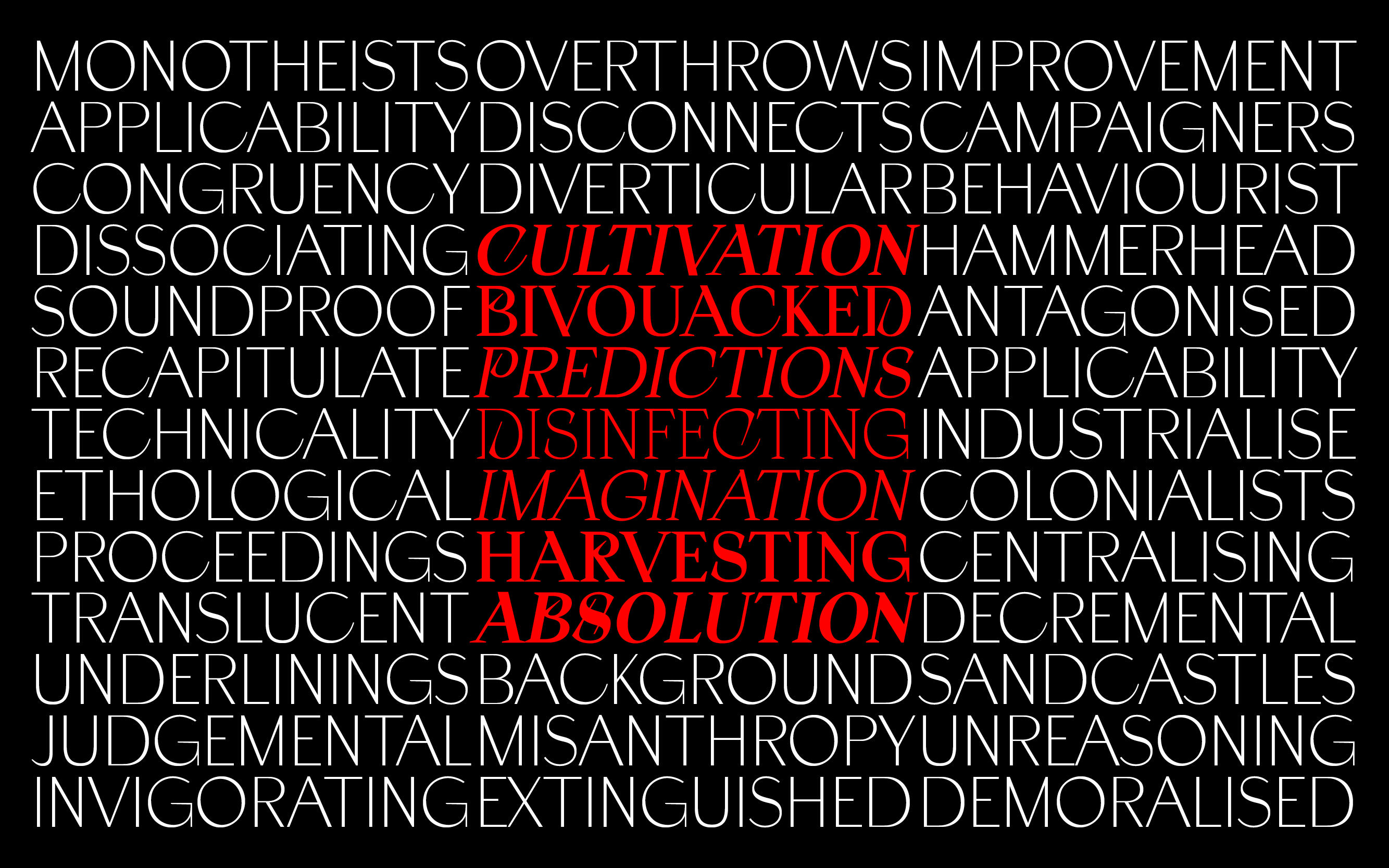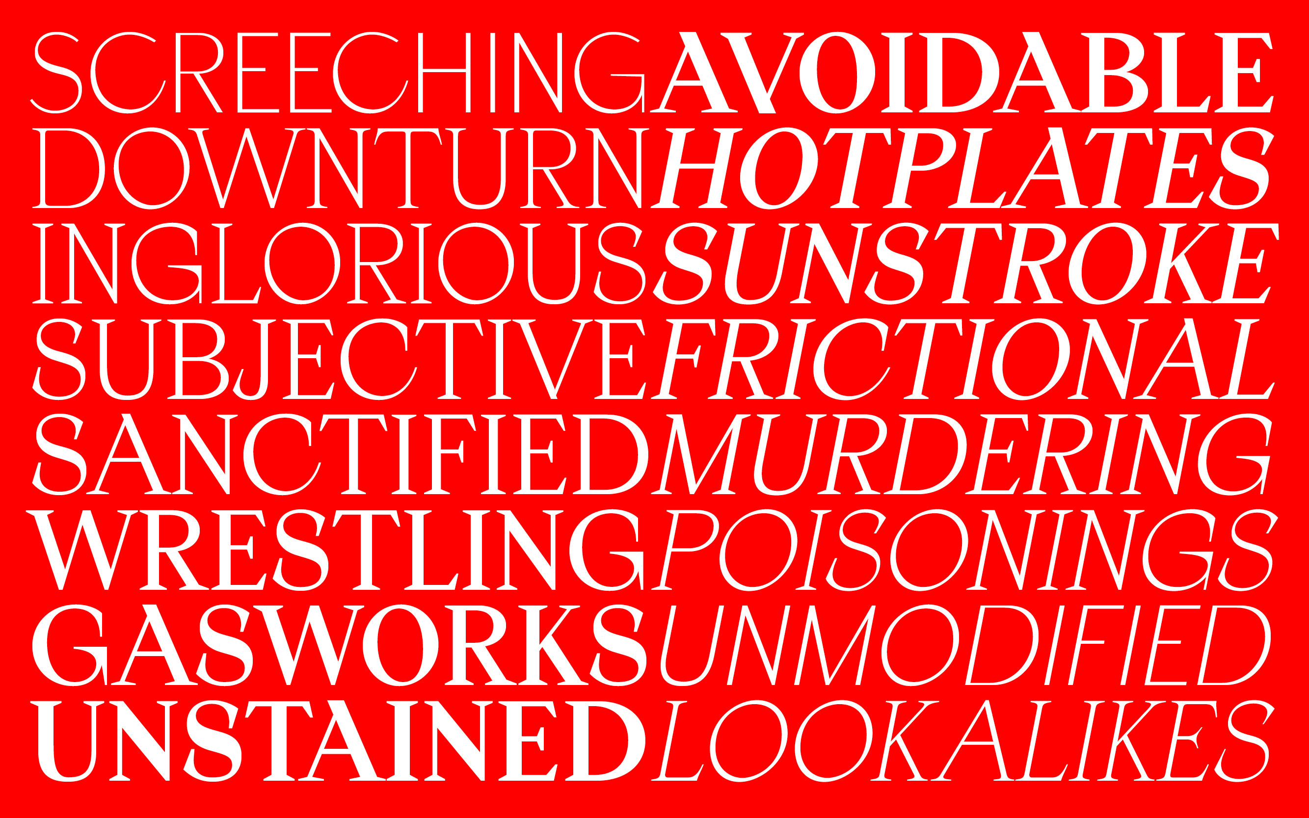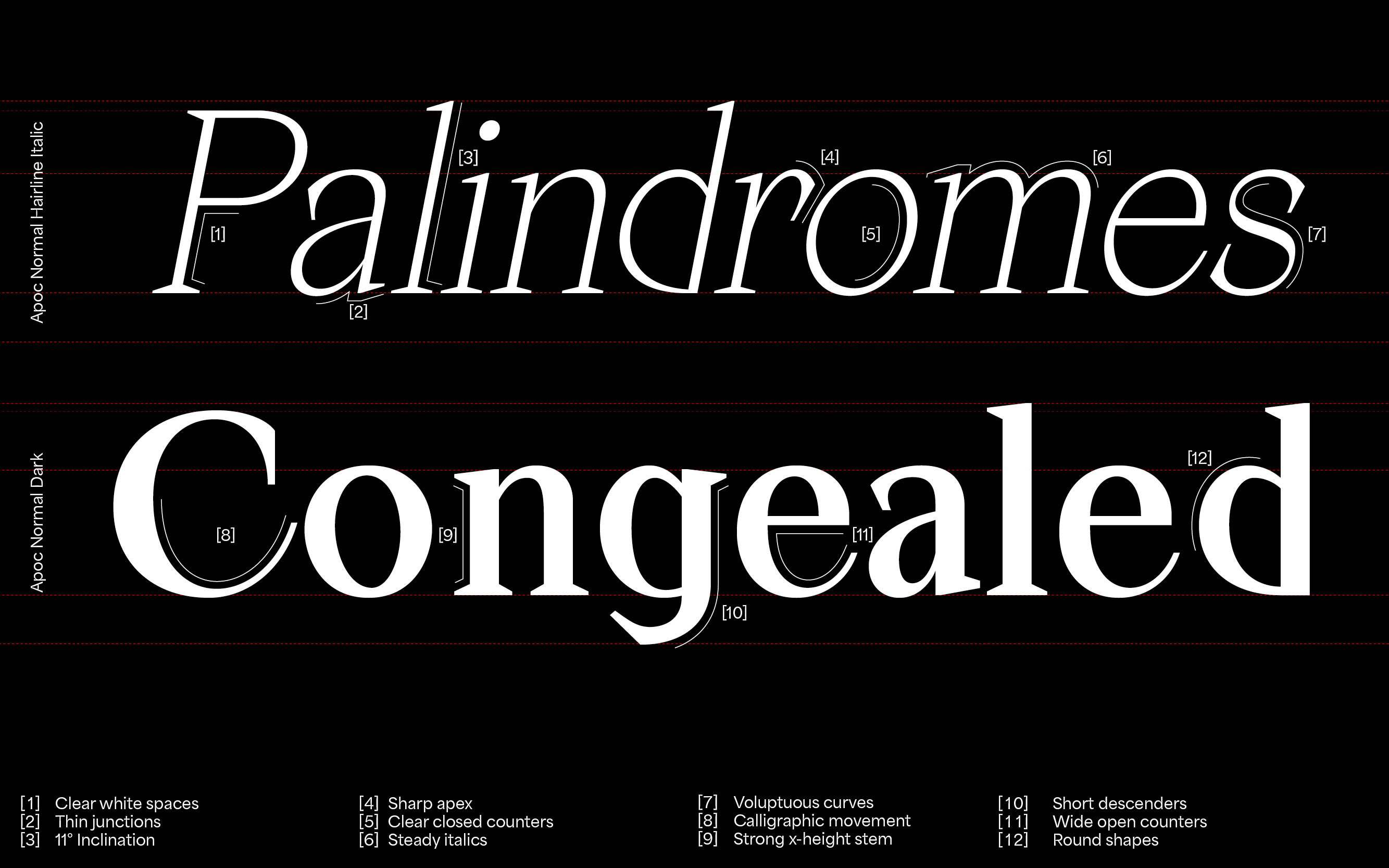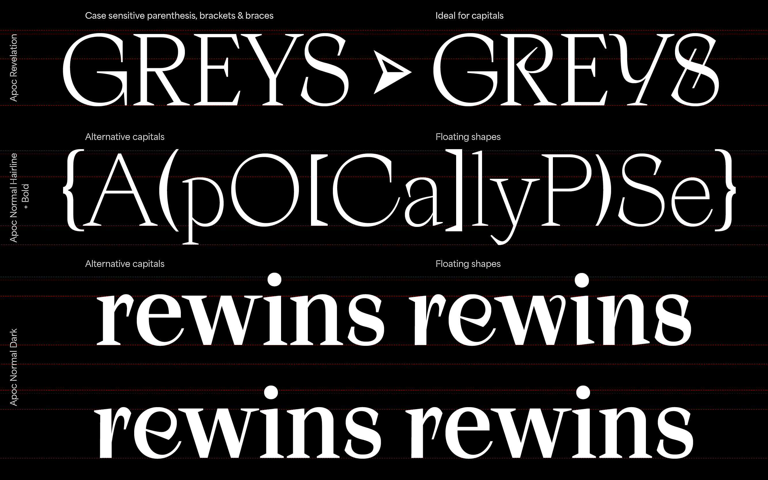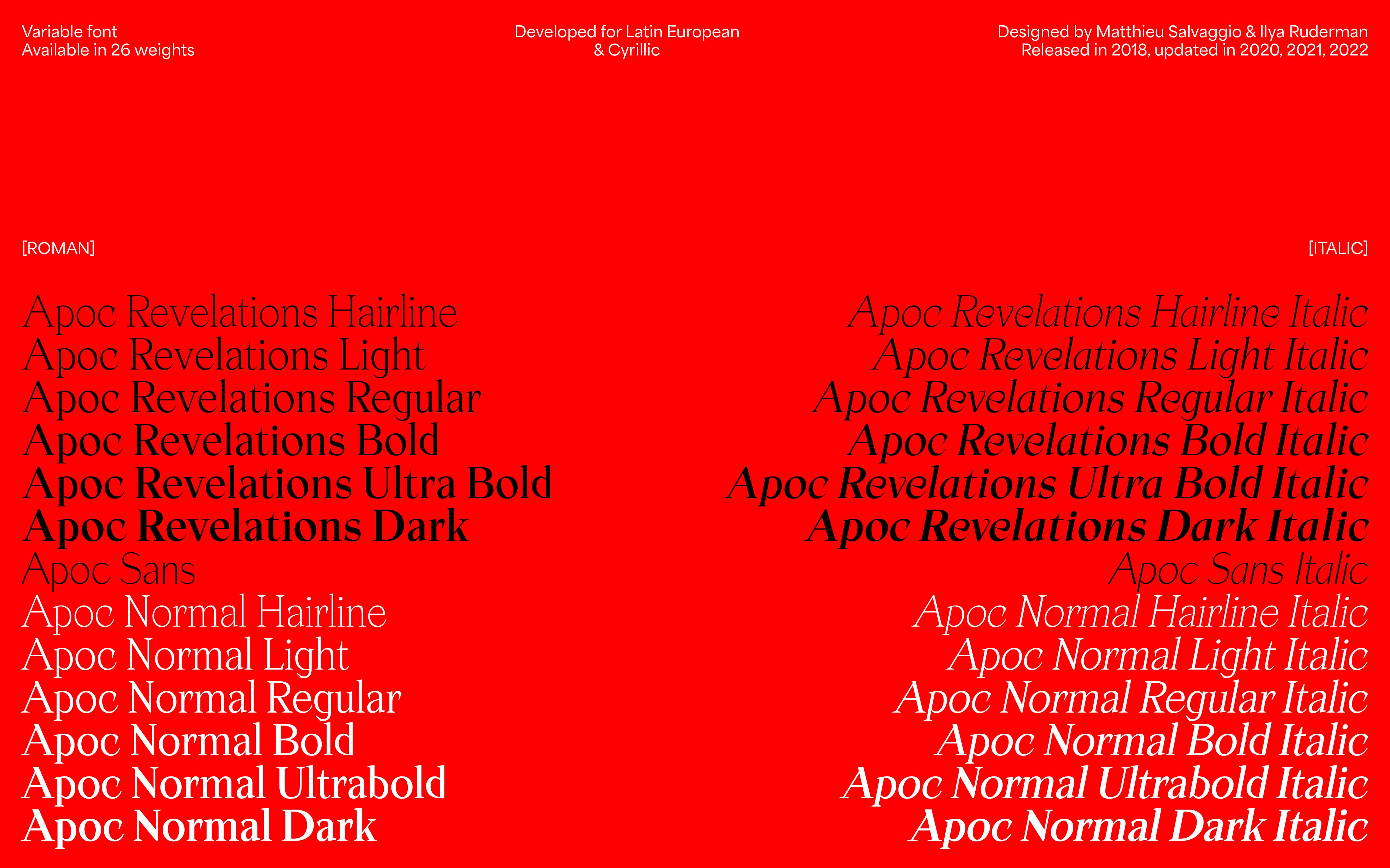 Apoc embodies the battle between Light and Dark. Apoc(alypse)'s sharp character set & alternates were released in 2018 and updated in 2020 & 2022 by Matthieu Salvaggio. Cyrillic languages were designed by Ilya Ruderman (Tomorrow Type) and Yury Ostromentsky (CSTM Fonts). Defined by designers as the most popular typeface of standout contemporary independent design, Apoc is an elegant, sharp, expressive font family, perfect for bold standout displays focusing on heavy font uses.