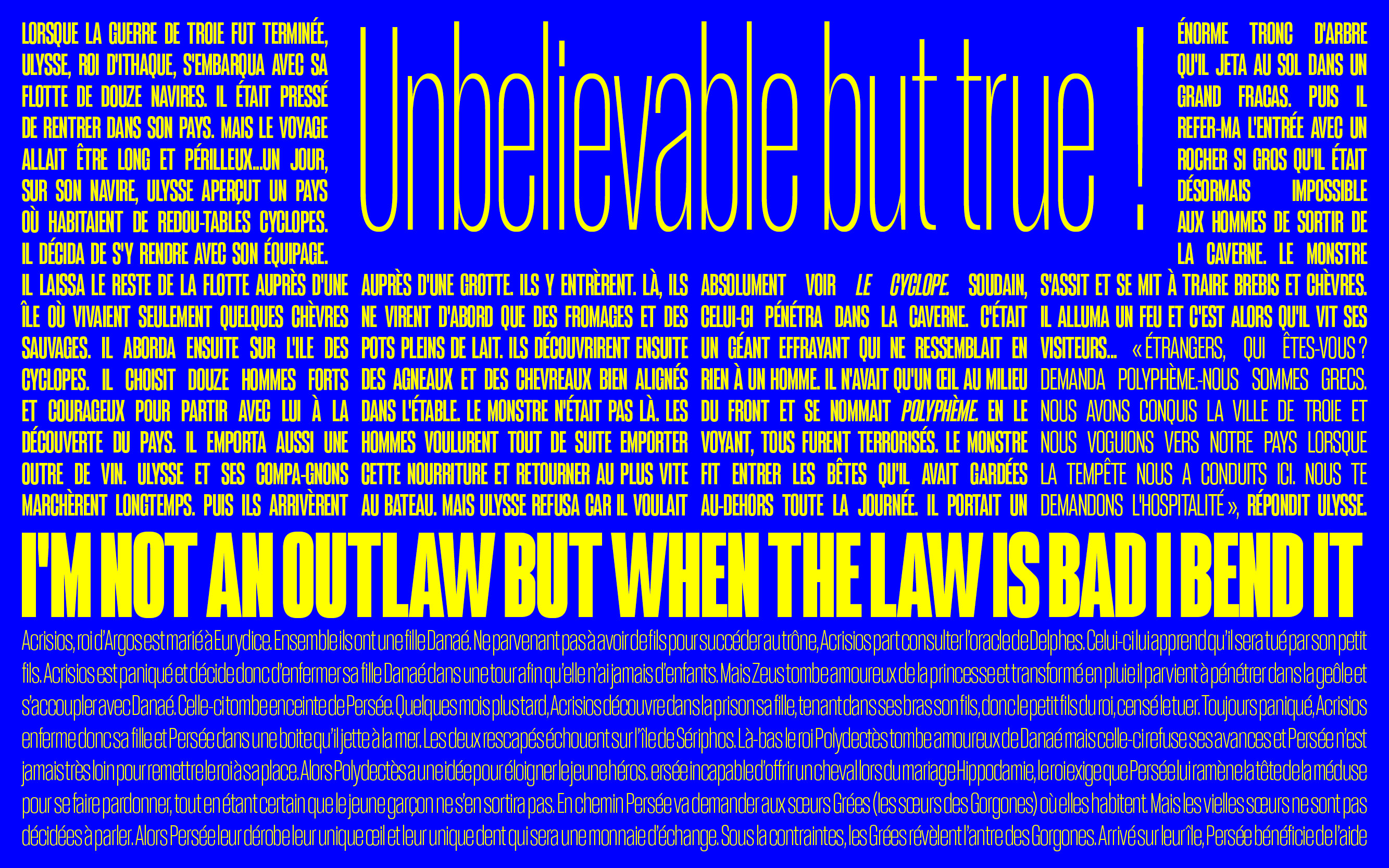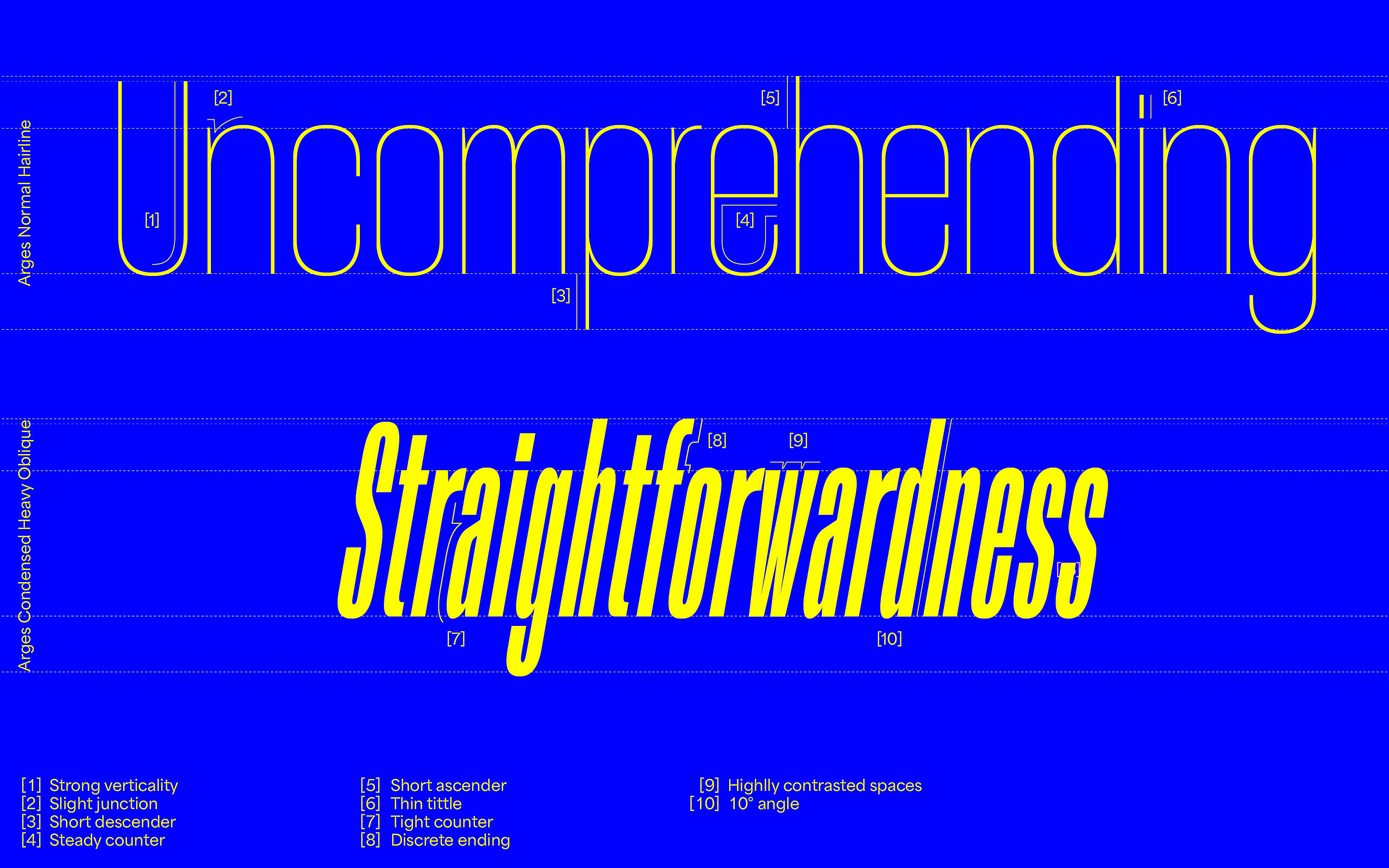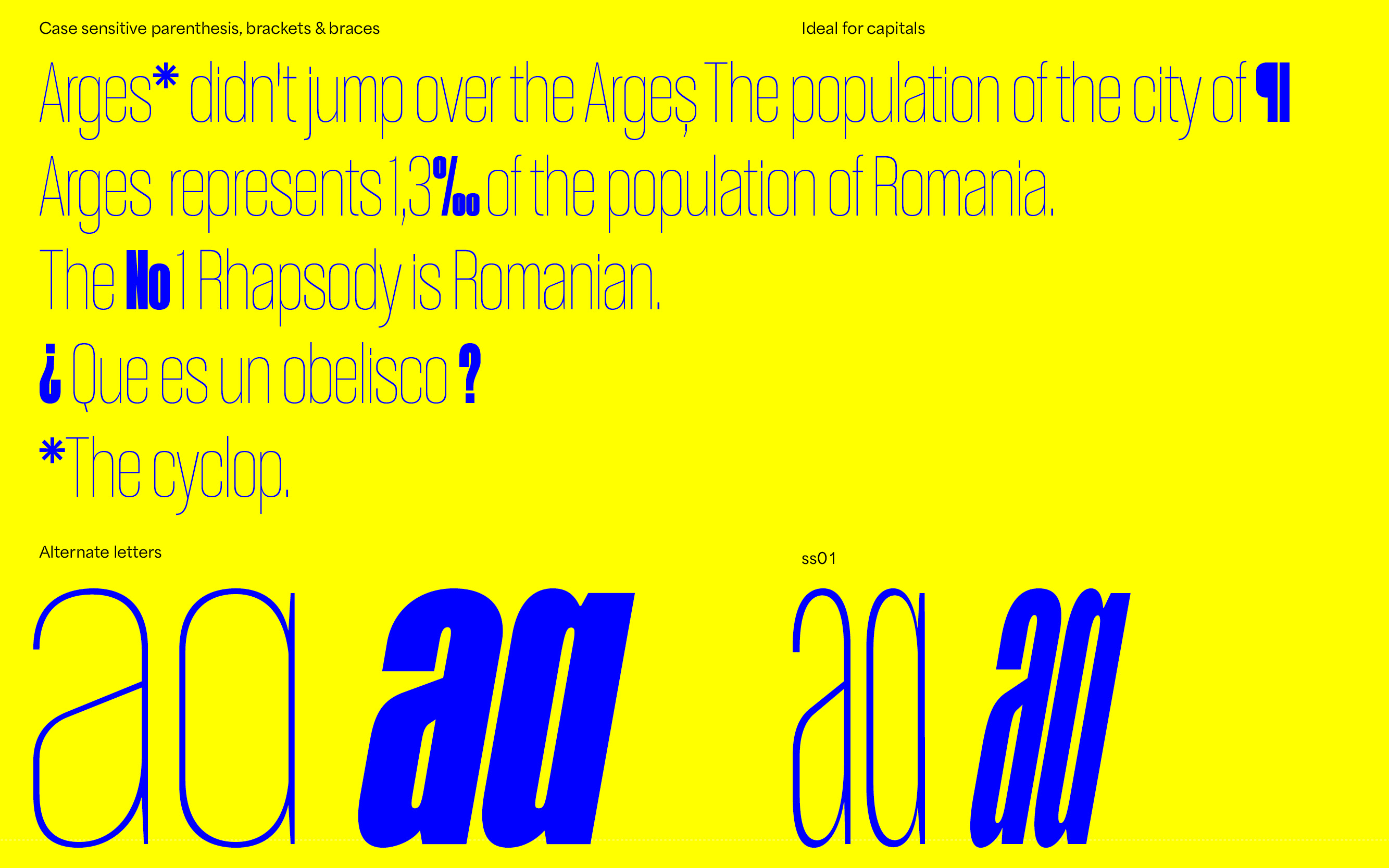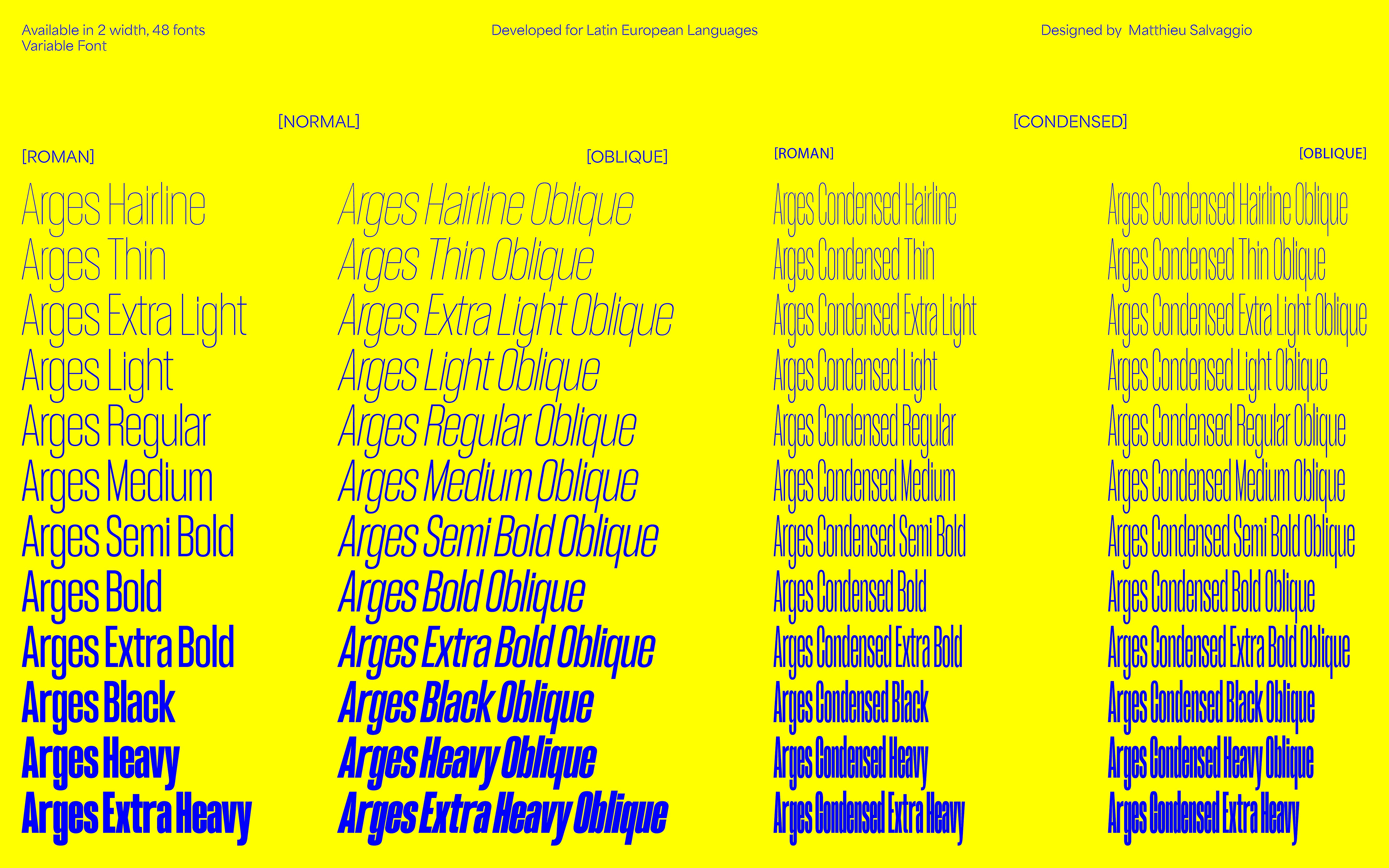 Arges was Inspired by the famous Cyclope who helped forge Zeus’ thunder weapon. Completely rethought and fully redesigned during 2018–2019, Arges became a super family of 11 weights+matching obliques & two styles (Normal/Condensed). Originally thought to be a heavy font-tool meant for display and headlines it was completely revamped into a typeface family containing several useful weights for various text sizes and layouts.