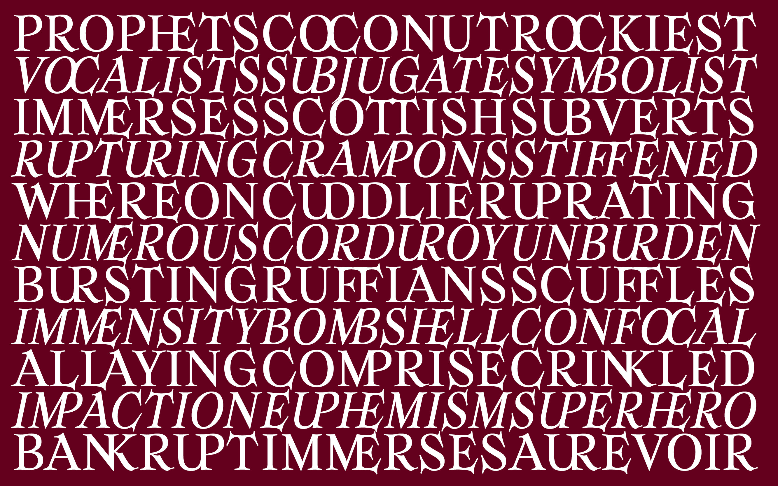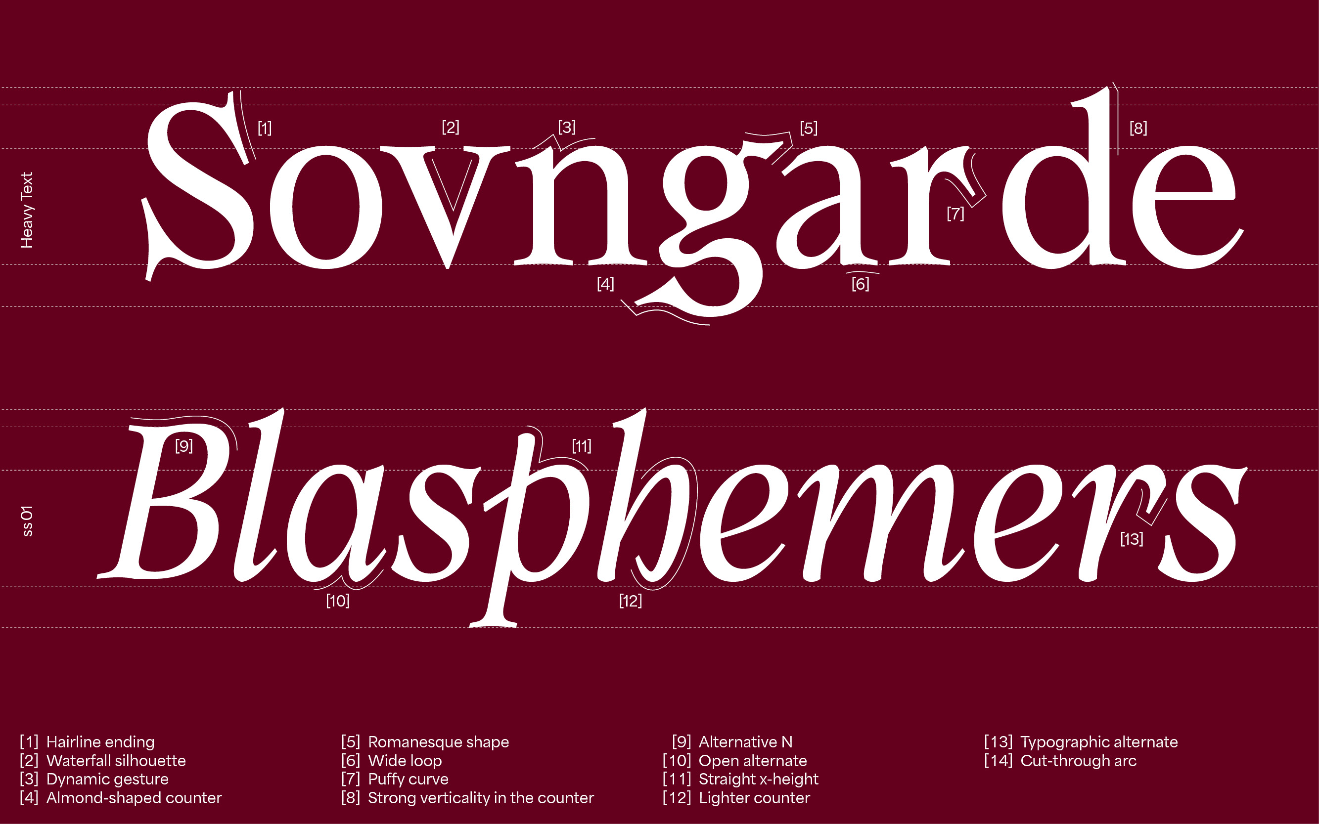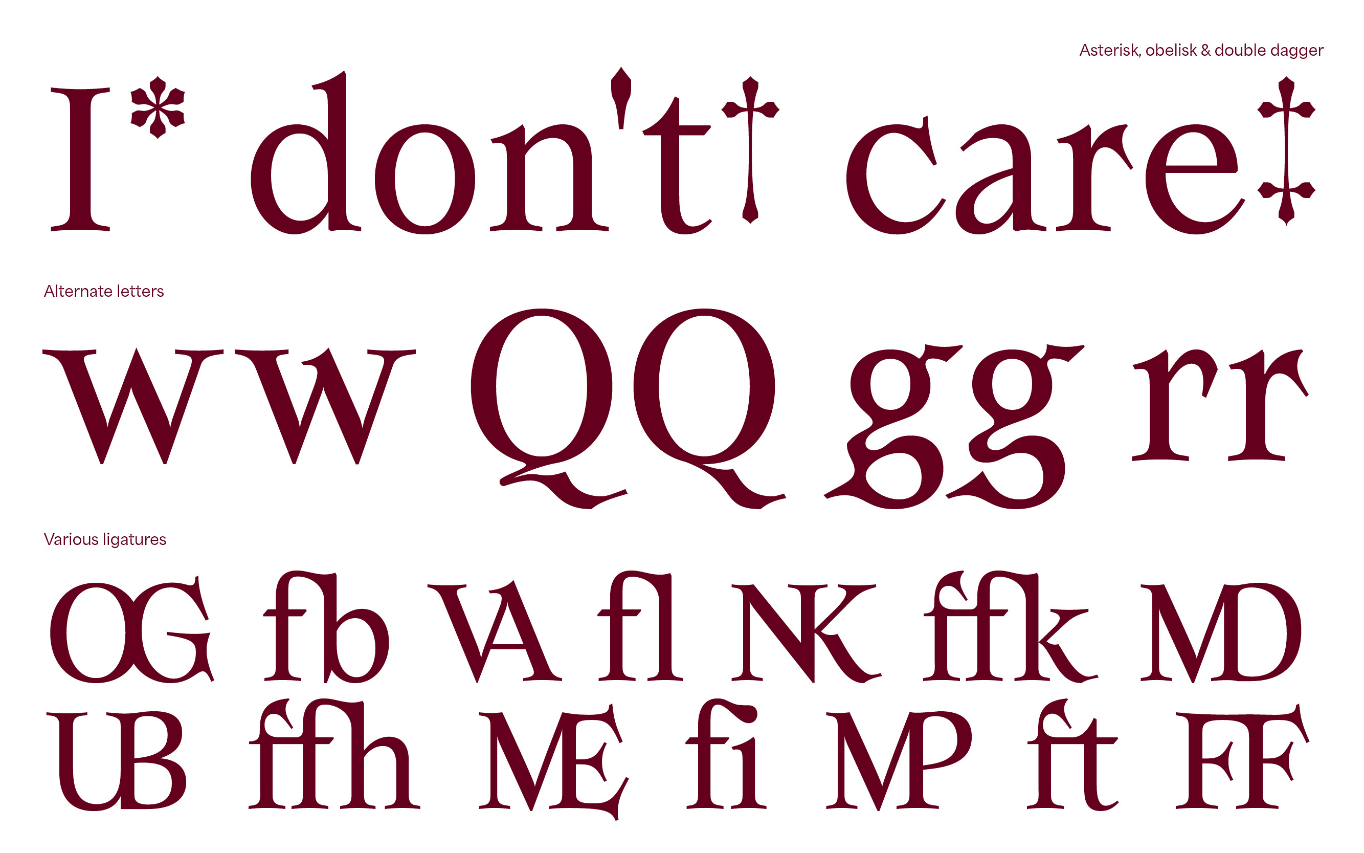 This 20th century serif font has numerous alternates and ligatures, making it a sharp tool allowing more experimentation in any kind of design project. The old fashioned print style give Armag an almost biblical appearance, represented by the evilness of its horned letterform. We are also working on expanding the Armag font-family with various weights, widths and, of course, alternates & ligatures.