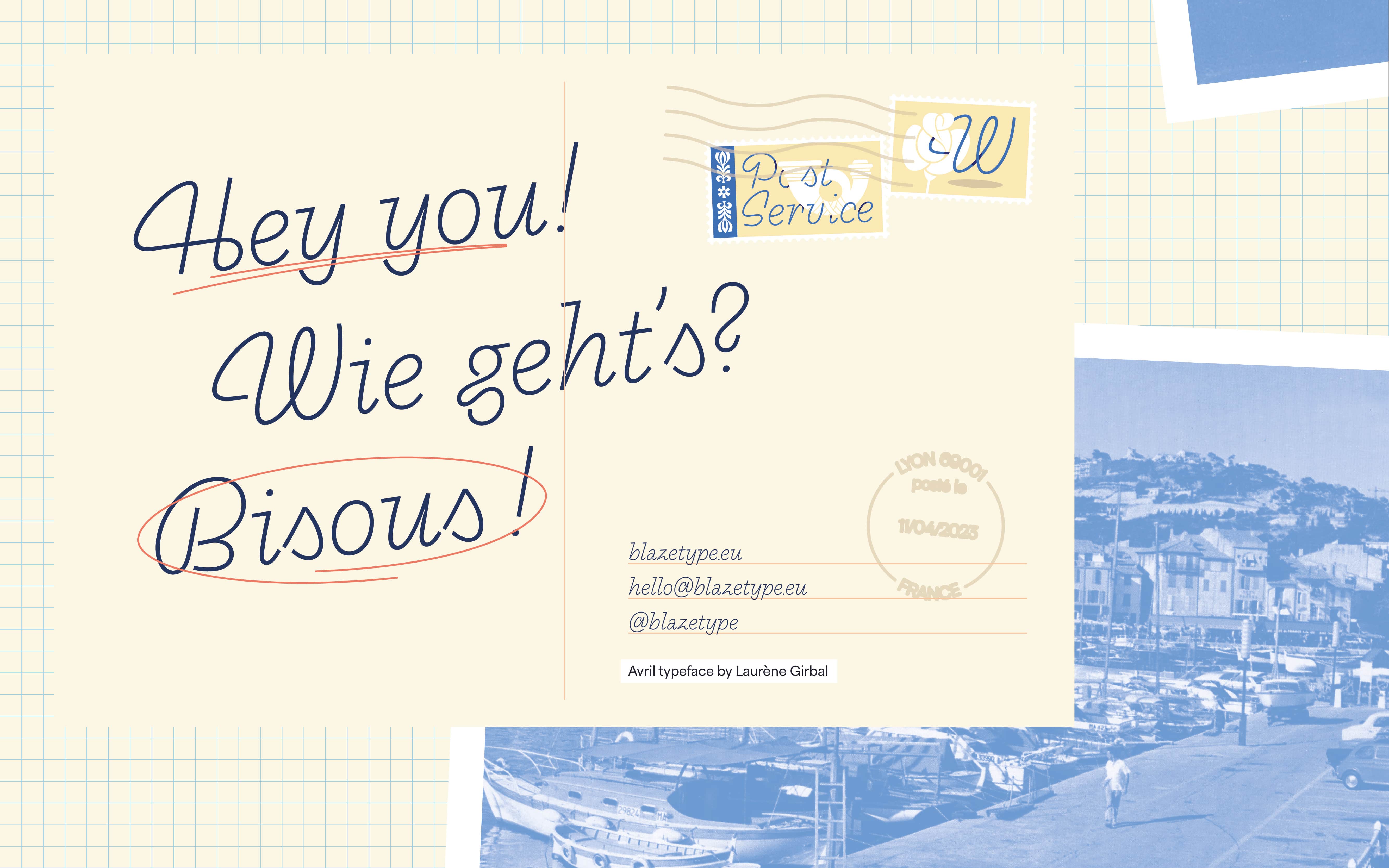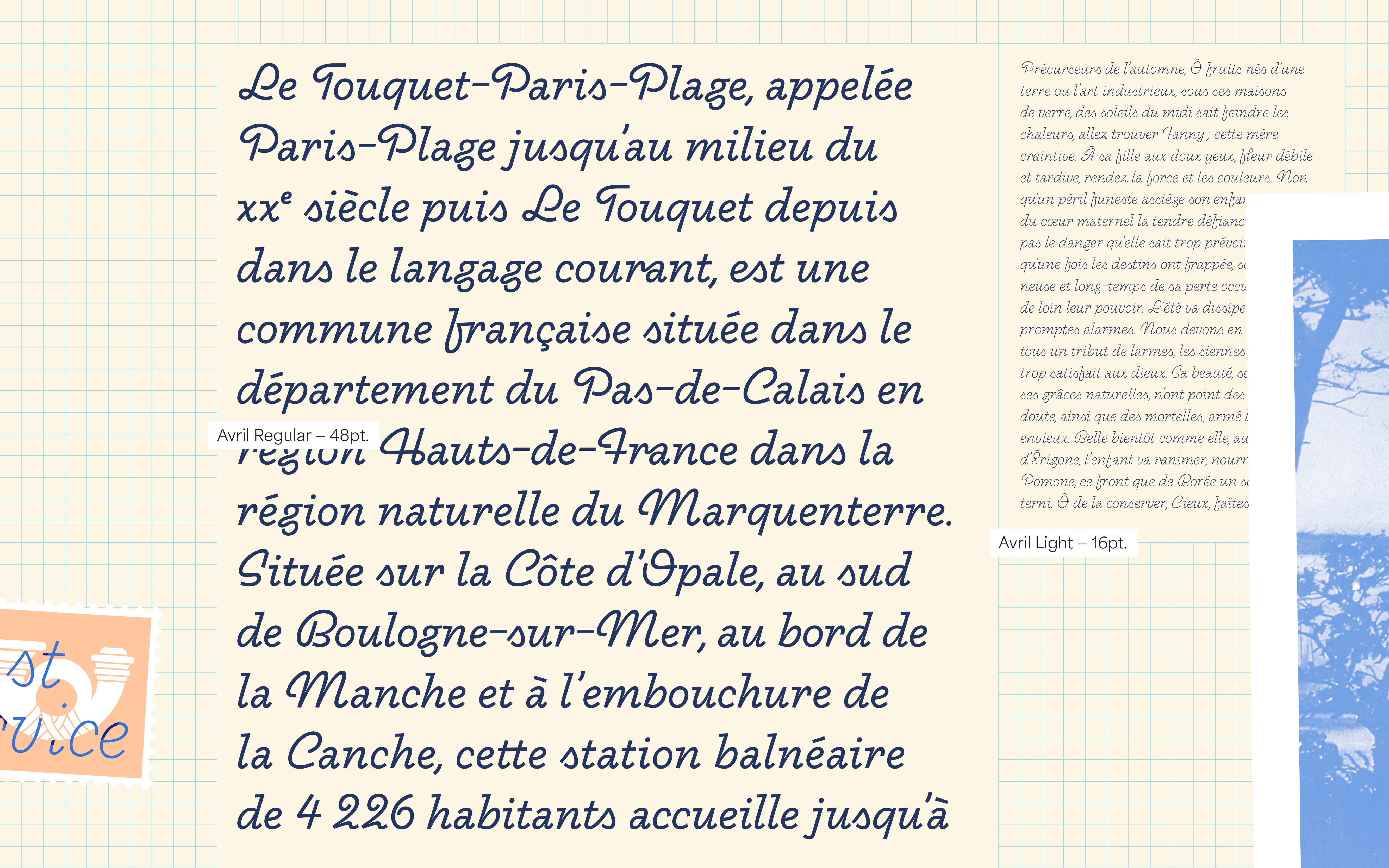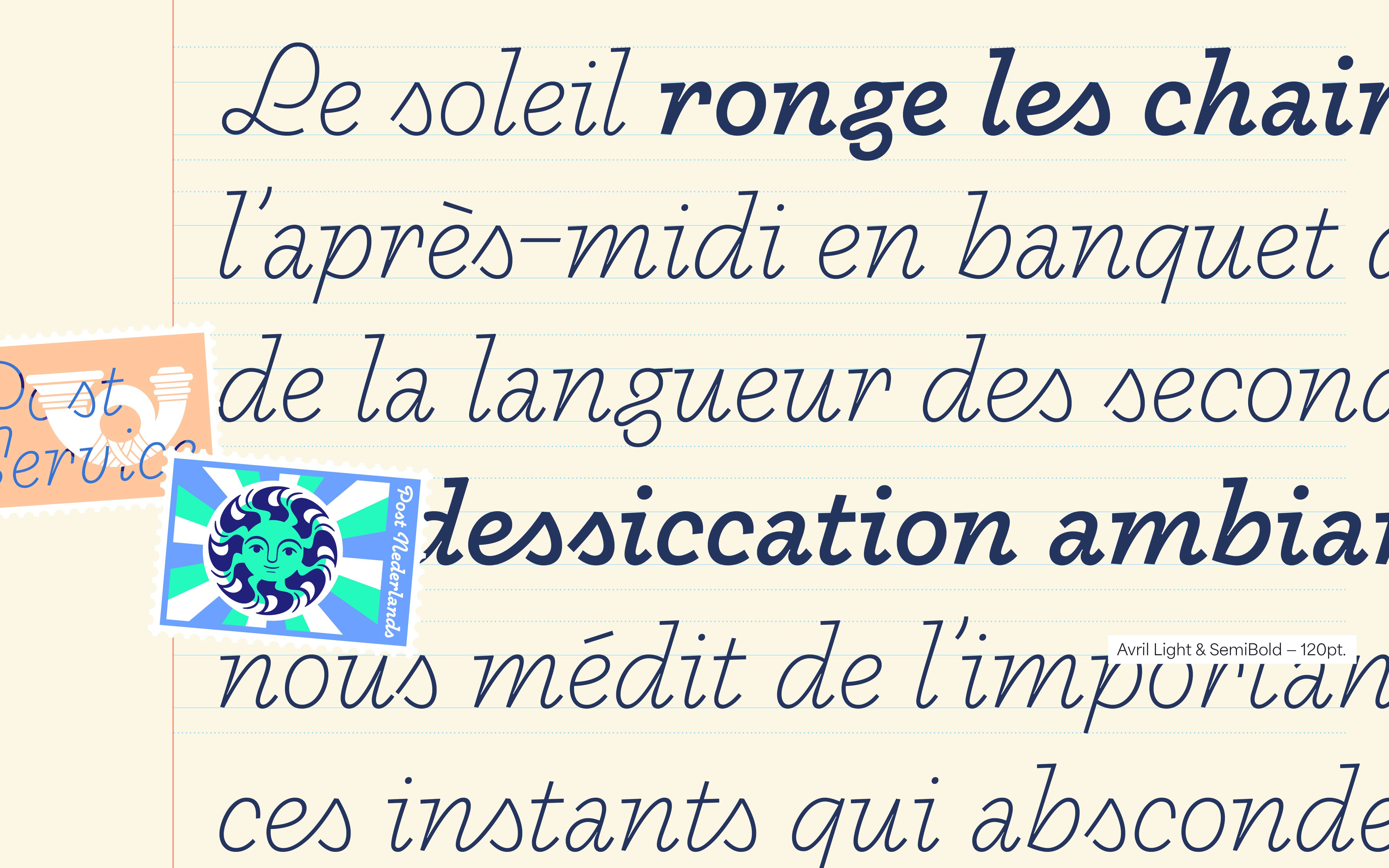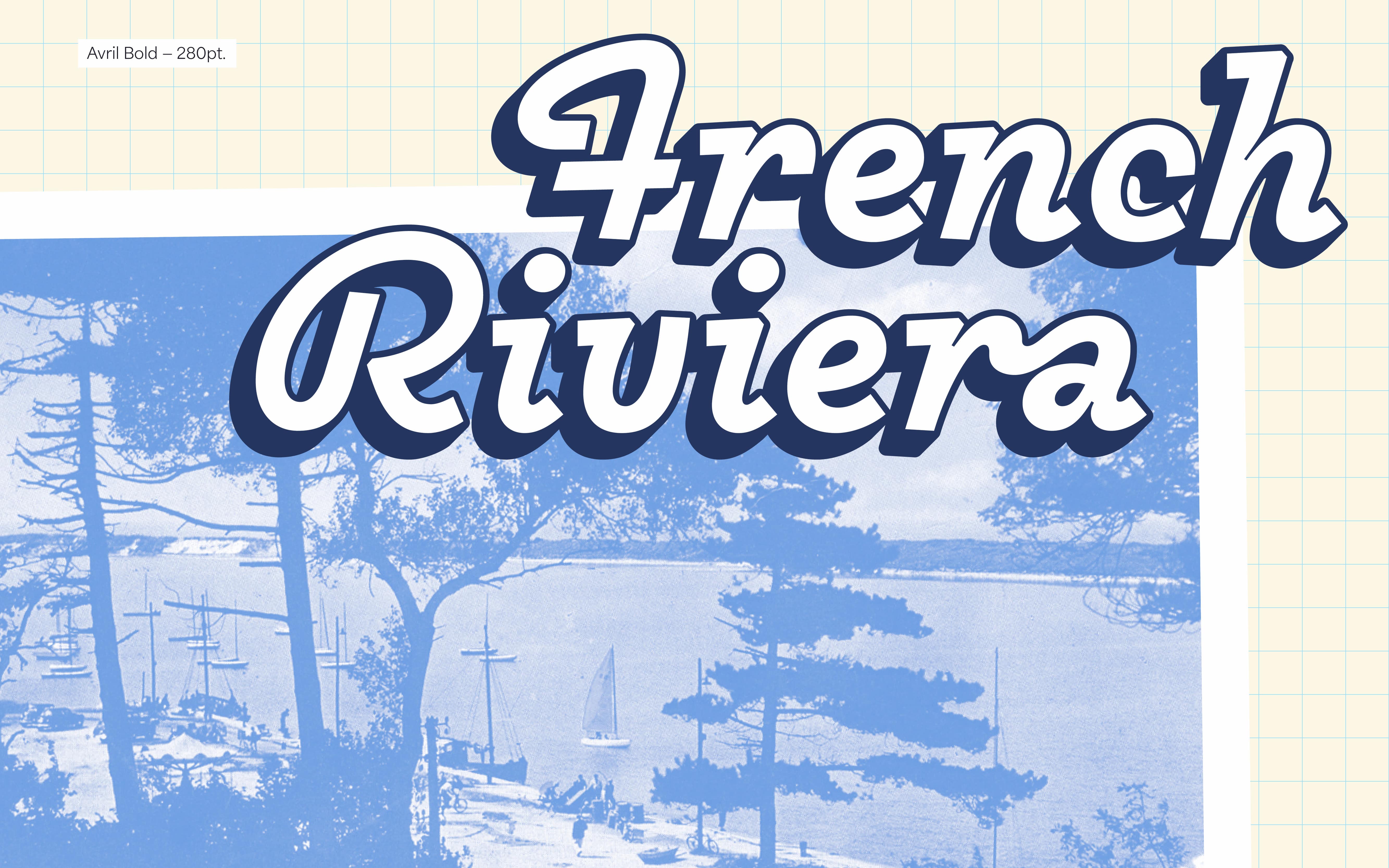 Avril font is a chill but lively script typeface loosely inspired by a french sign painting advertising books from the fifties “La lettre dans la peinture et la publicité” from Jean Joveneaux. The font features expressive semi-connecting characters, stressed moments low contrast that mimic a dynamic handwriting. Its loopy curves that seem traced out an unbroken line make Avril font a chill, playful and distinctive script typeface. Originally developed in one weight, the font has grown into five styles from thin to bold. It was initially thought for display applications, but the chilled lighter styles perform well for longer paragraphs whereas bolder weights will be ideal for headlines. And lastly, the name of this typeface was chosen as a tribute to spring and its refreshing vibes. Avril font is inviting you to a chill Saturday afternoon, ideally during an exciting travel. Welcome aboard!