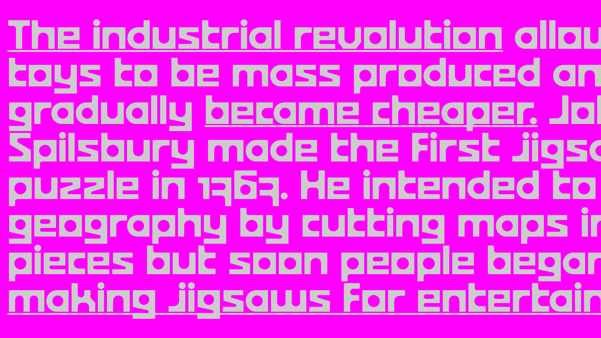Built from a simple geometric formal repertoire, Bonto is an expressive display typeface that comes in four styles. Directly inspired by our childhood games, the idea of this typeface was to create the most expressive typeface with the most simple shapes. Like lego or puzzle games, the letters come together in a contrasting combination of right angles and roundness. Bonto is designed to encourage play and experimentation through typographic composition. Several alternative glyphs can help the designer find the right combination. The alternative glyphs "e", "s" and "z" behave like descenders passing under the baseline, allowing for variations in the reading rhythm. In its black style, Bonto can be similar to a domino game, while the regular brings out the contrast of the round counter-forms. Bonto is best used large and playful, perfect for creating impactful and user-friendly designs
