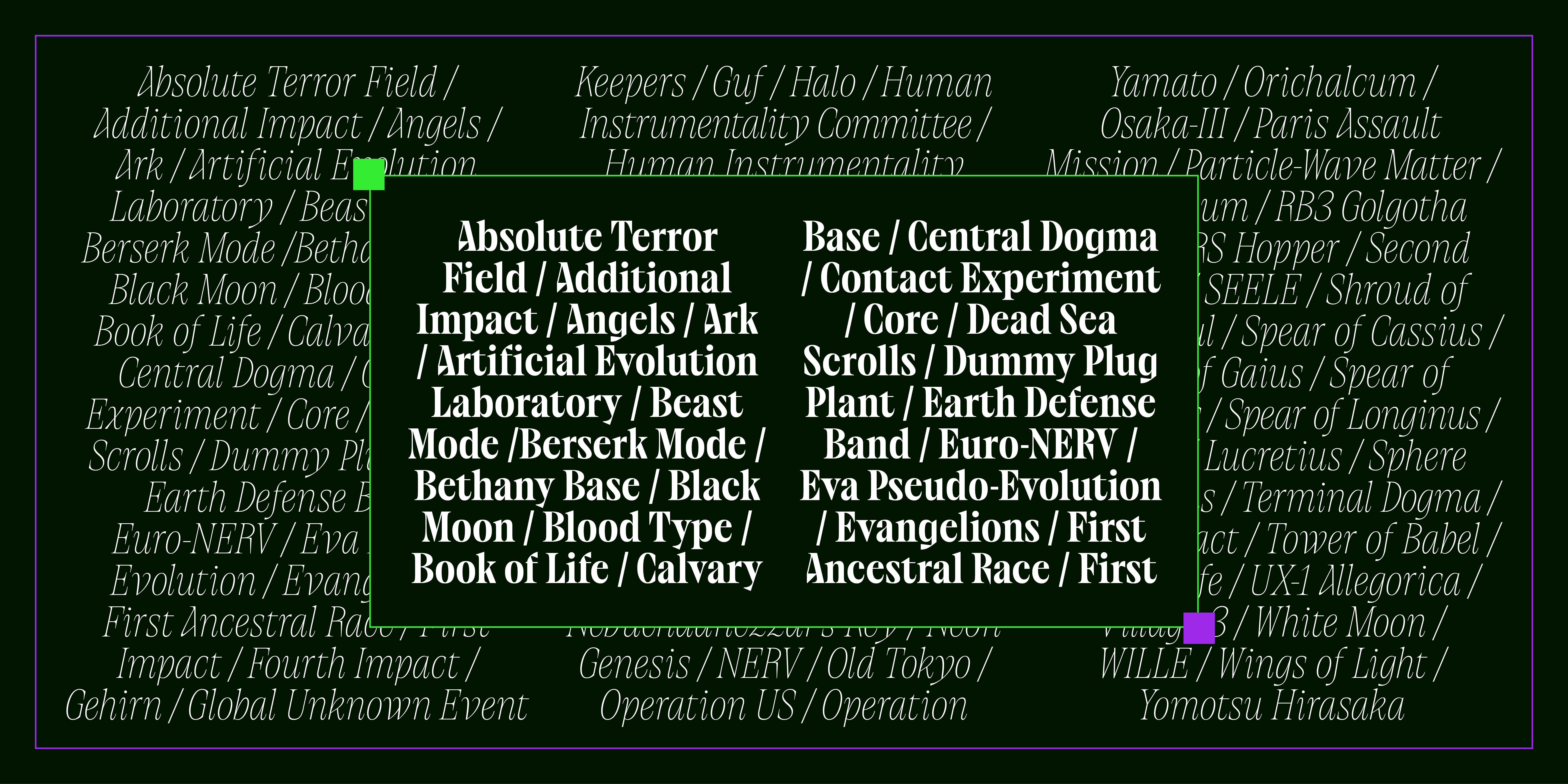 Collapse is an austere and melancholic condensed serif, crafted with an air of stark pessimism. Loosely inspired by the iconic serif typeface seen in the opening titles of Neon Genesis Evangelion, it draws upon the haunting atmosphere of that series while quickly diverging into something more expressive, more severe.