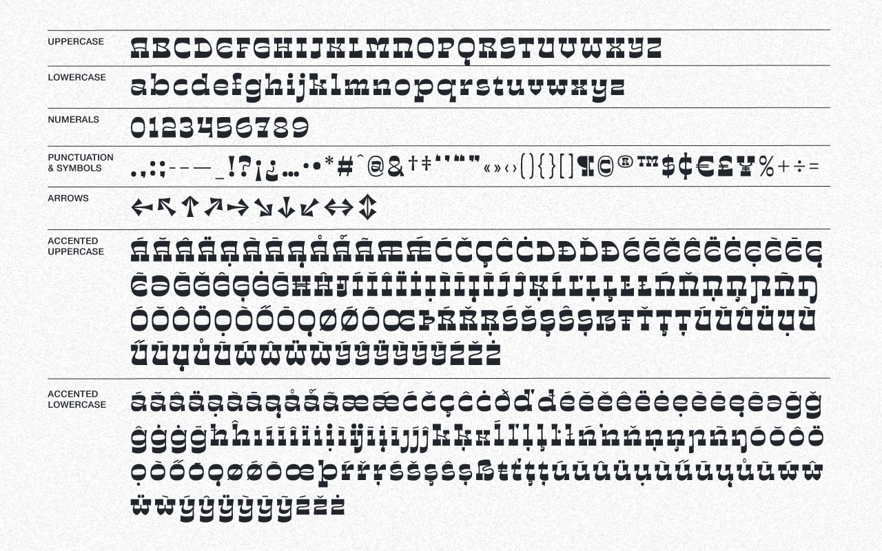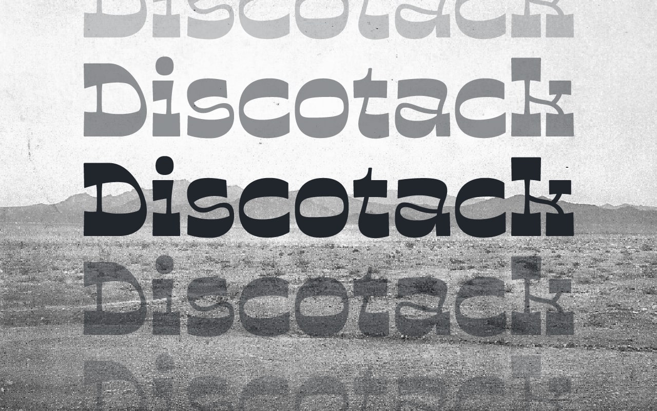 Discotack is a mixture of Art nouveau and desert disco. It's a reverse contrast slab serif with organic, flowing strokes and a load of personality. Initially inspired by the uppercase forms of Benguiat’s Discotheque (1967), the font takes an off-kilter approach to a genre typically marked by straight lines and angles. Set it in all caps for a (mostly) flat top and bottom to your lines of text, or add in the lowercase to introduce a playful wavy texture to your type. Discotack is perfect for headlines and logos.