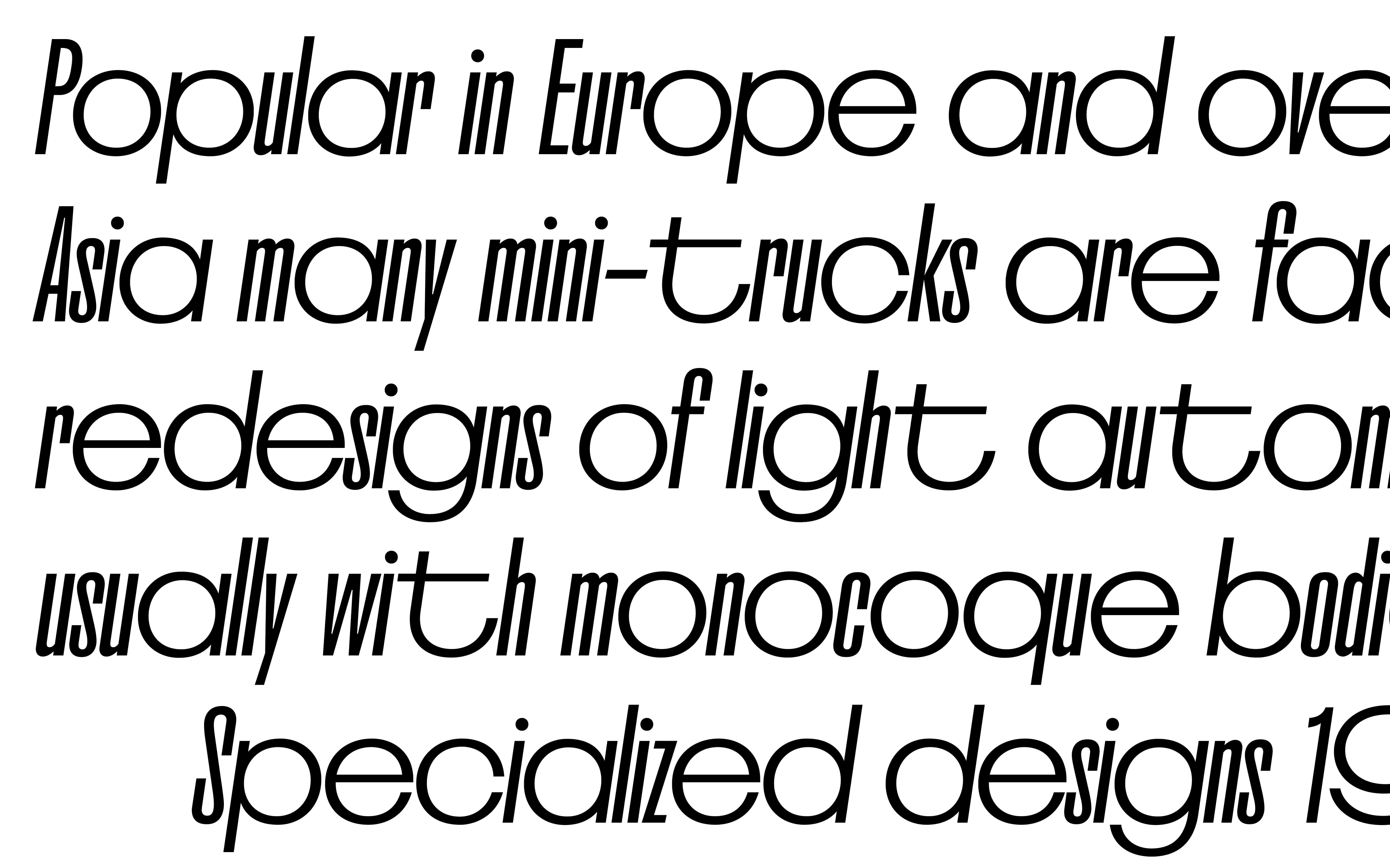 Dudler is a design initiated by a situation at a petrol station – a Swiss truck spotted in Val Venosta valley. Narrow, italic like letters and straight paired wide round shapes make rhythm the central design aspect of Dudler. Stylistic narrow alternates for every wide glyph allow the user to become the composer of the rhythm in every word and typesetting. Dudler’s slight italic angle of 8° brings dynamism to its design and gives even more rhythm to any type of composition. Its striking visual language makes it well suited for display and headlines around all kind of projects: posters, websites, motions and so on.