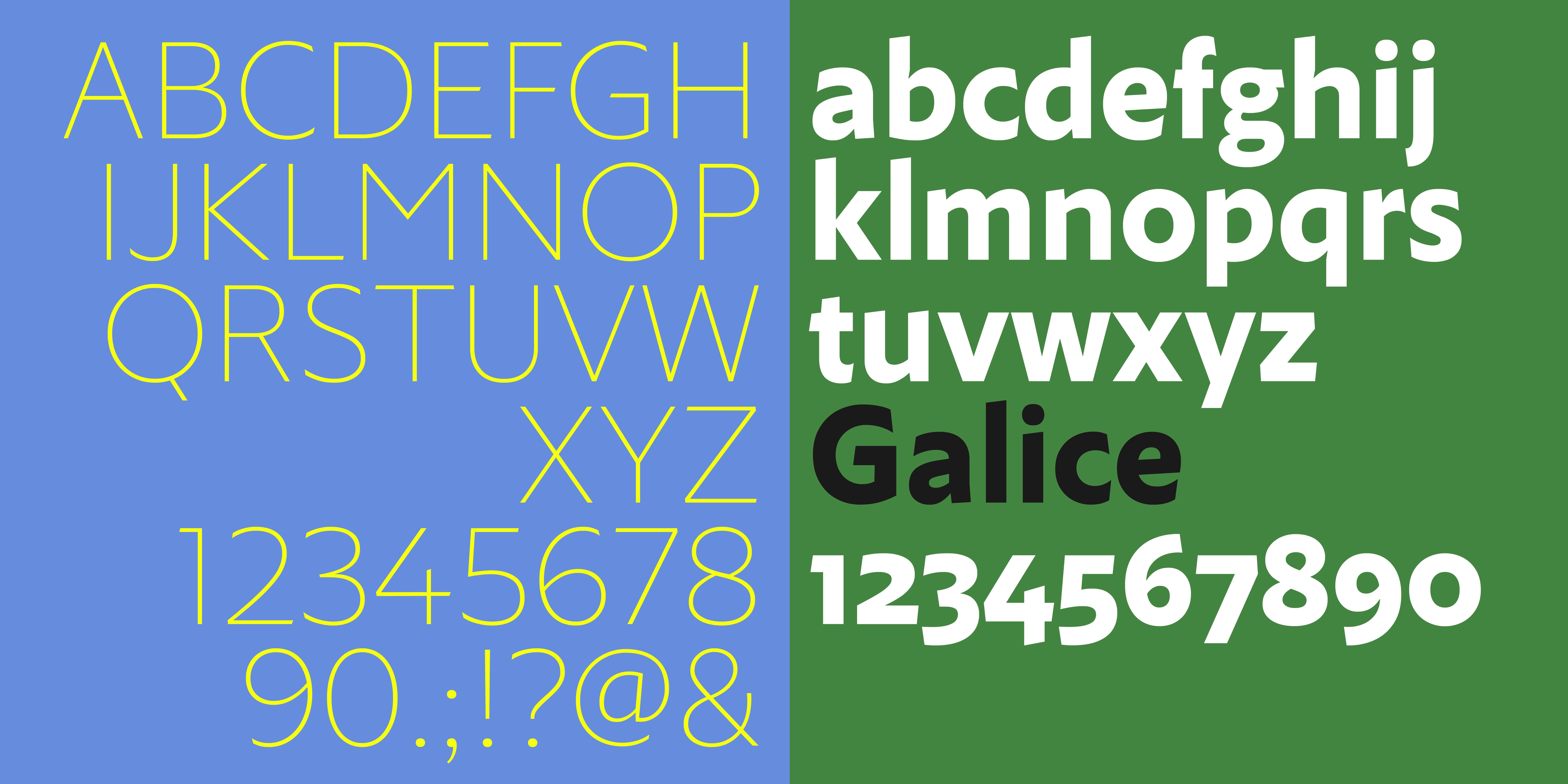 Galice is a humanistic sans serif typeface that effortlessly balances modern design with the organic forms typical of traditional serif fonts. Inspired by humanist letterforms, Galice features subtle curves and a variety of stroke widths, giving it a warm, approachable feel without sacrificing legibility or clarity. Its design blends the crispness of sans serifs with the slight variation in thickness that echoes the natural rhythm of handwriting, creating a friendly yet professional appearance.