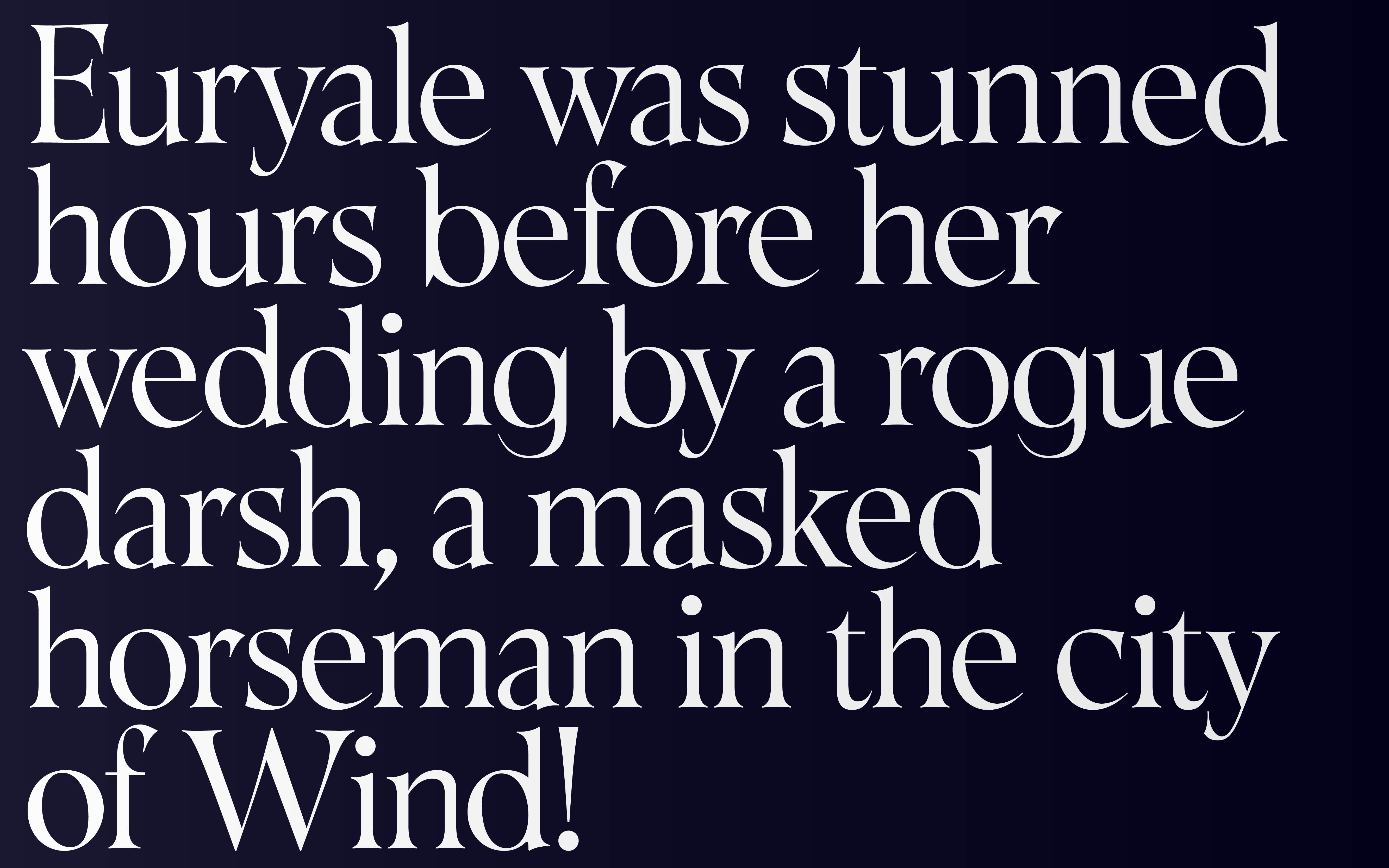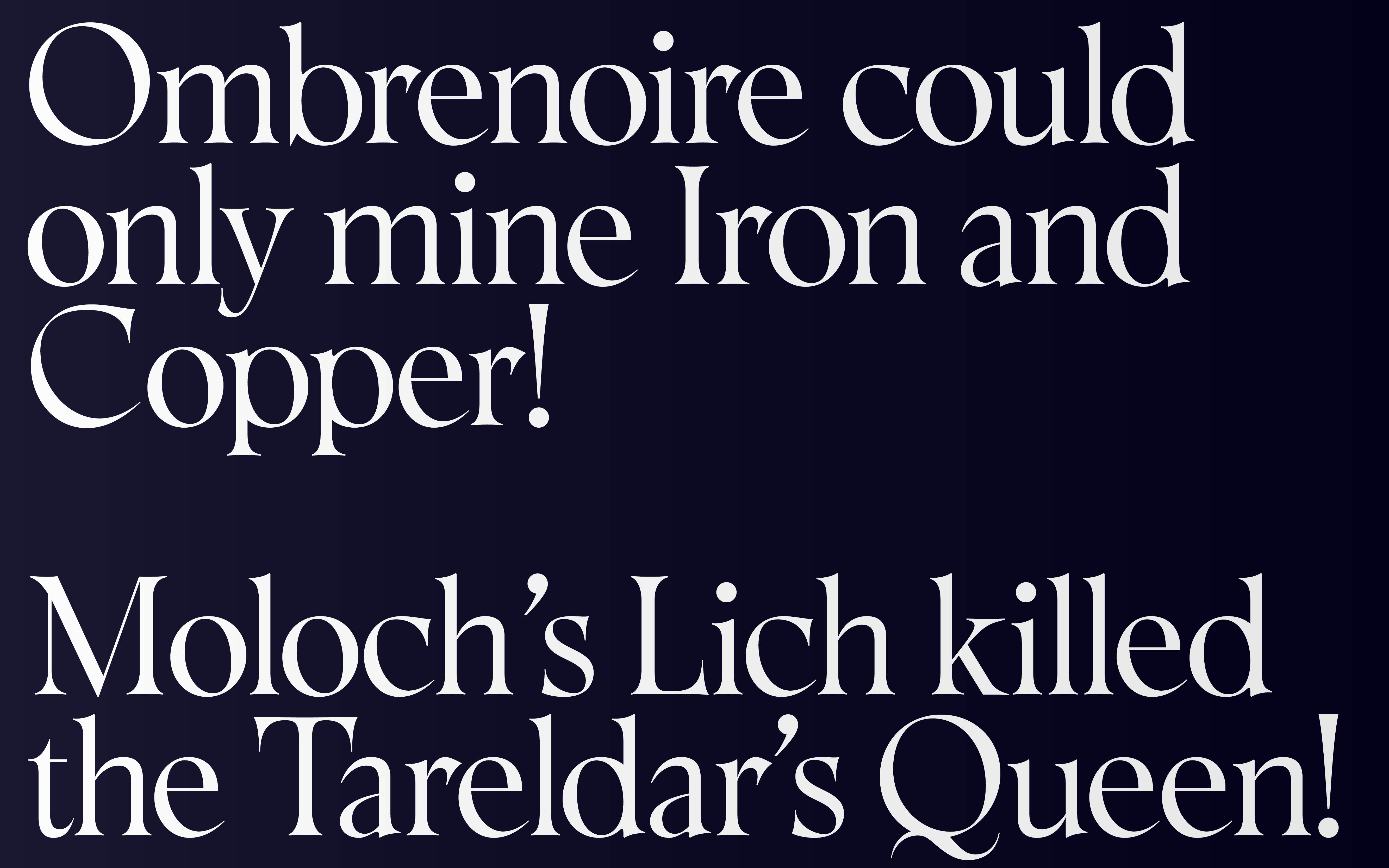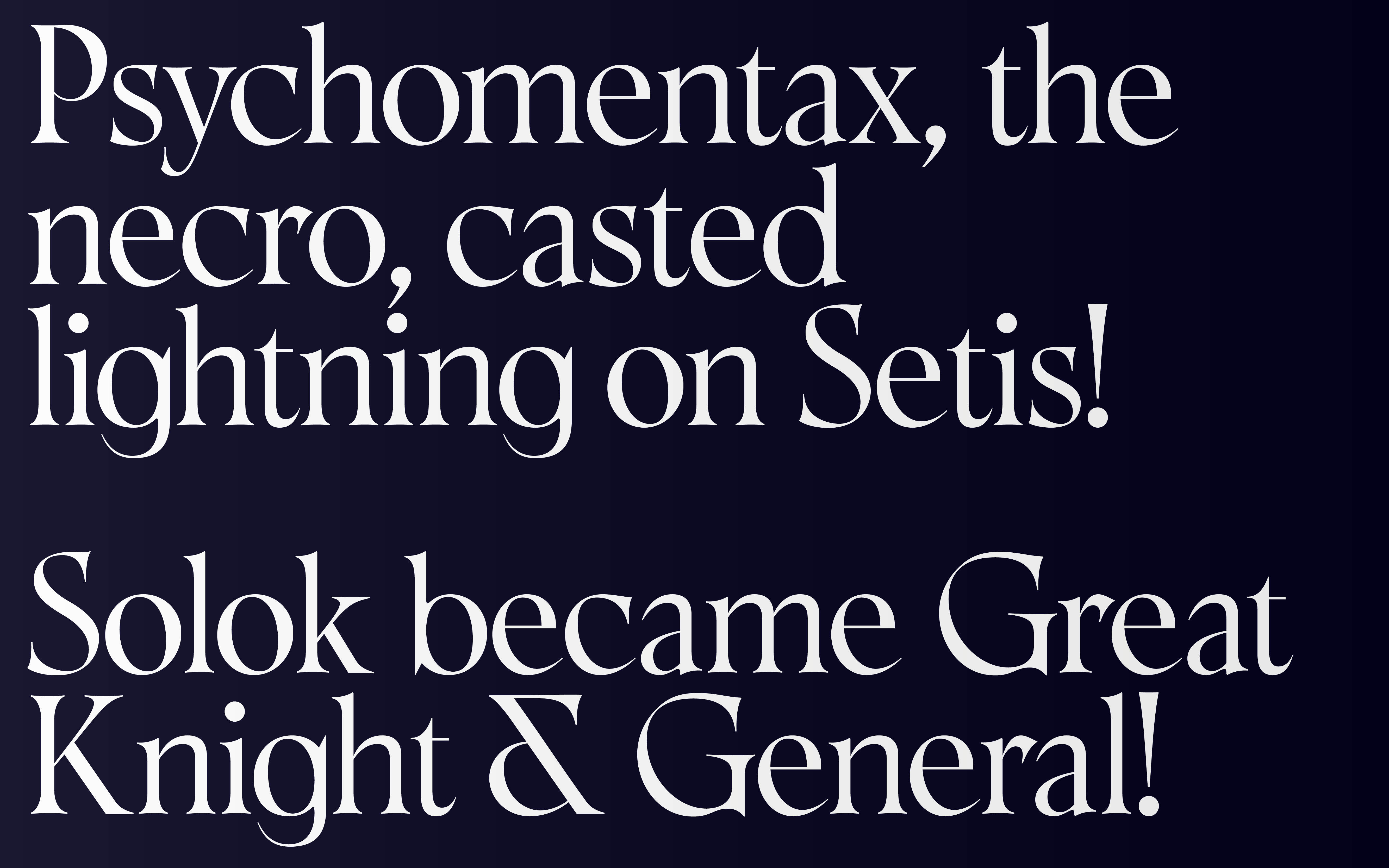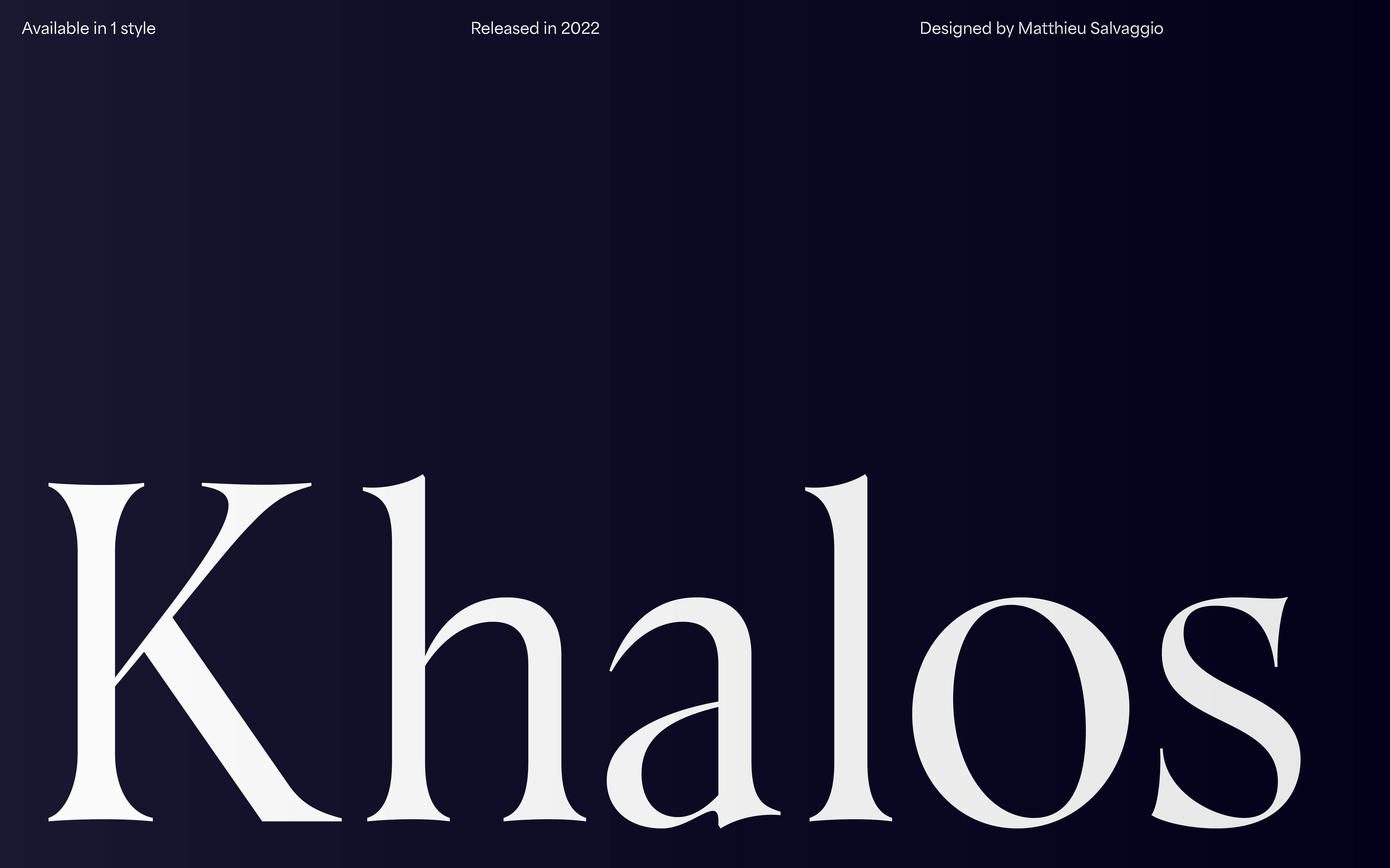 Khalos is a font inspired by the adventures of a group of Darshanides on the video game Ultima Online, and more specifically on the Dark Prophecy shard circa 2002. Its long spiky serifs and highly contrasted round shapes are a balance between elegance and barbed feelings. A true echo to the world of Ultima online and the adventures of Shaar, Mentax, Ombrenoire, Khorne, Slanesh, Arcatus and Khalos. This font is a bridge between historical calligraphic ductus and a more modern and sensitive approach to the overall width rhythmic.