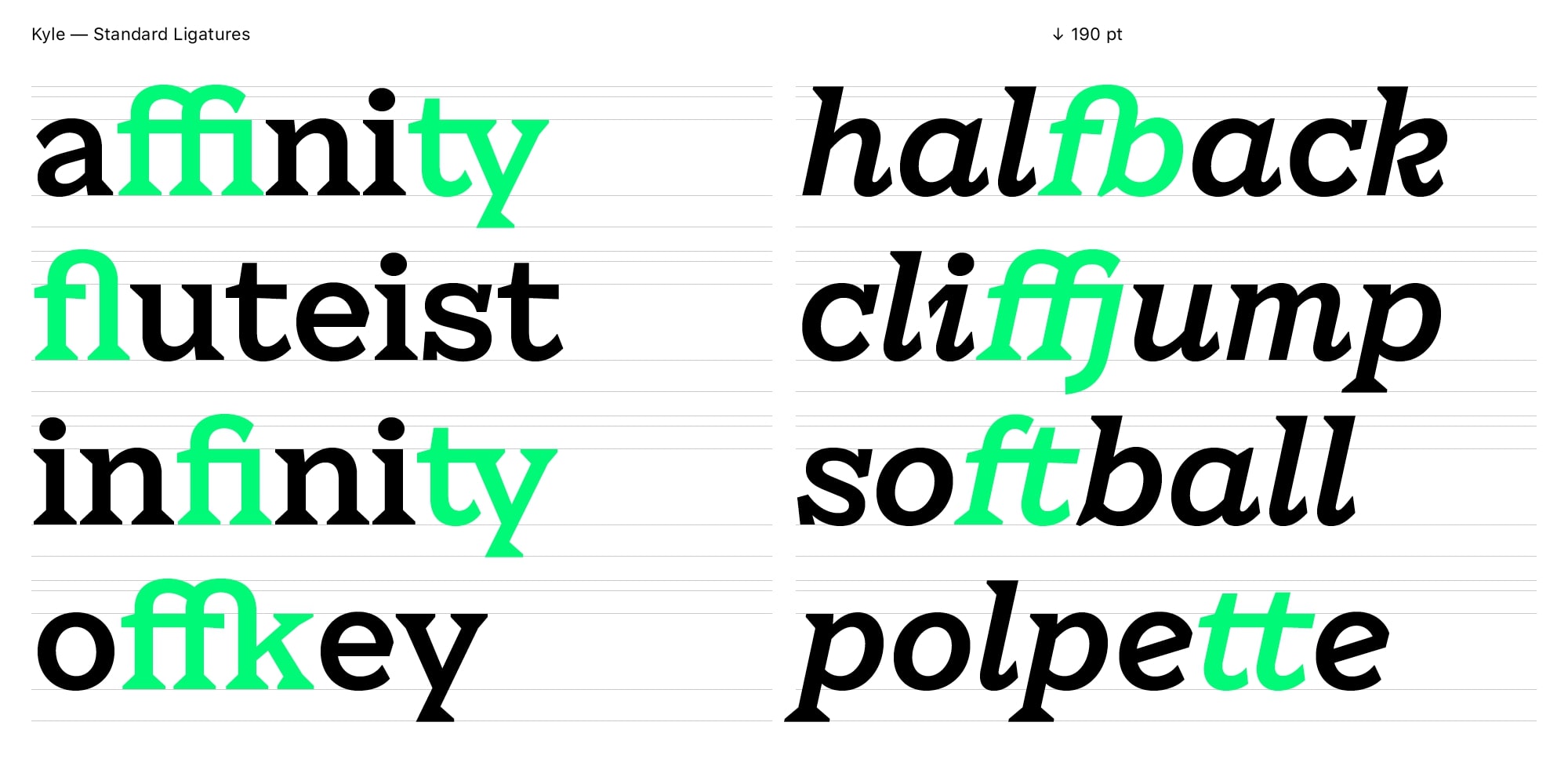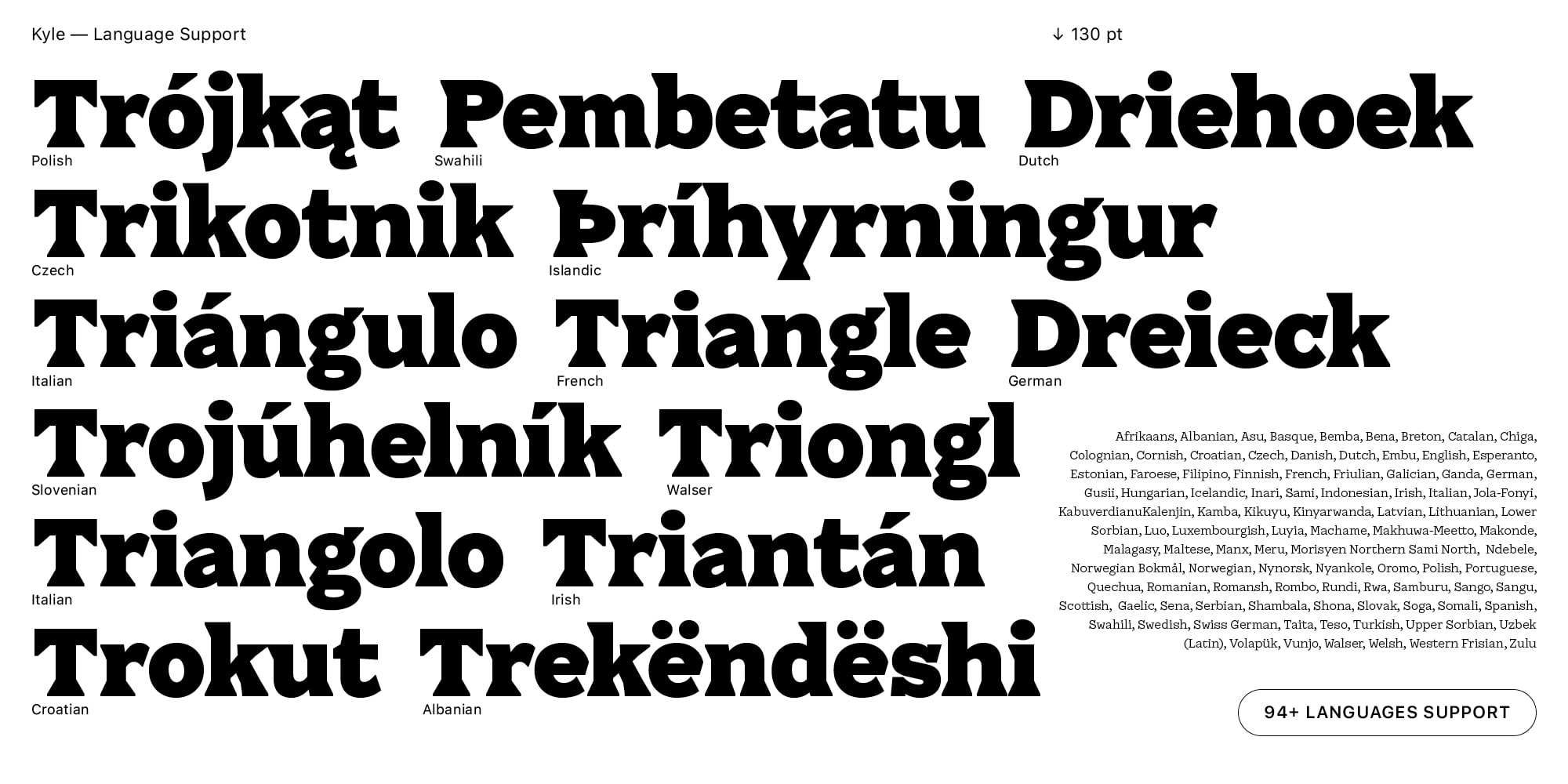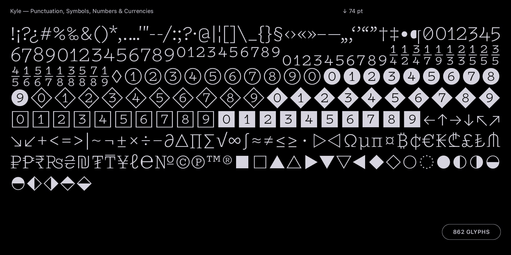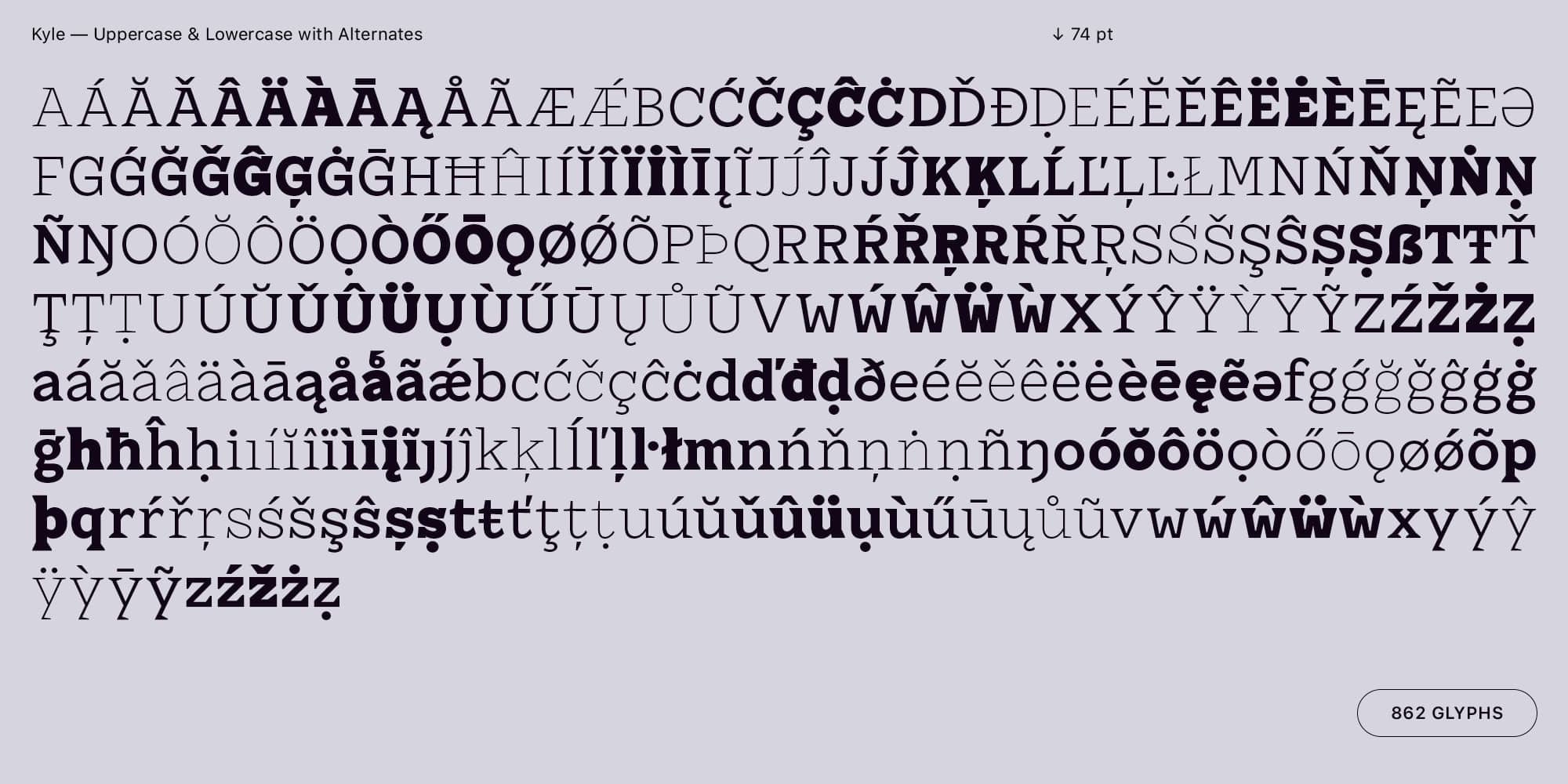 Kyle is a contemporary monoline serif font family with a typewriter touch. It changes its character with increasing weight: The fonts have sharp, triangular serifs, that gain momentum as the weight grows. The serifs change their look from the typical slab like typewriter form to strong triangular extremities, giving the font a strong standing and a lot of character. The heavier weights gain headline quality, showing detail that attracts attention and makes Kyle a great choice for a wide range of uses. The family is well equipped for todays typographic needs, including the most commonly used OpenType features like lining figures, ordinals, superior numbers and fractions. It also has an extended character set containing more than 800 glyphs supporting Eastern European languages as well as Central and Western European languages. Additionally it contains many practical symbols. The spacing of the letters was adjusted with a lot of care, preventing language typical spacing issues. Extensive testing in all common European languages leads to comfortable reading.