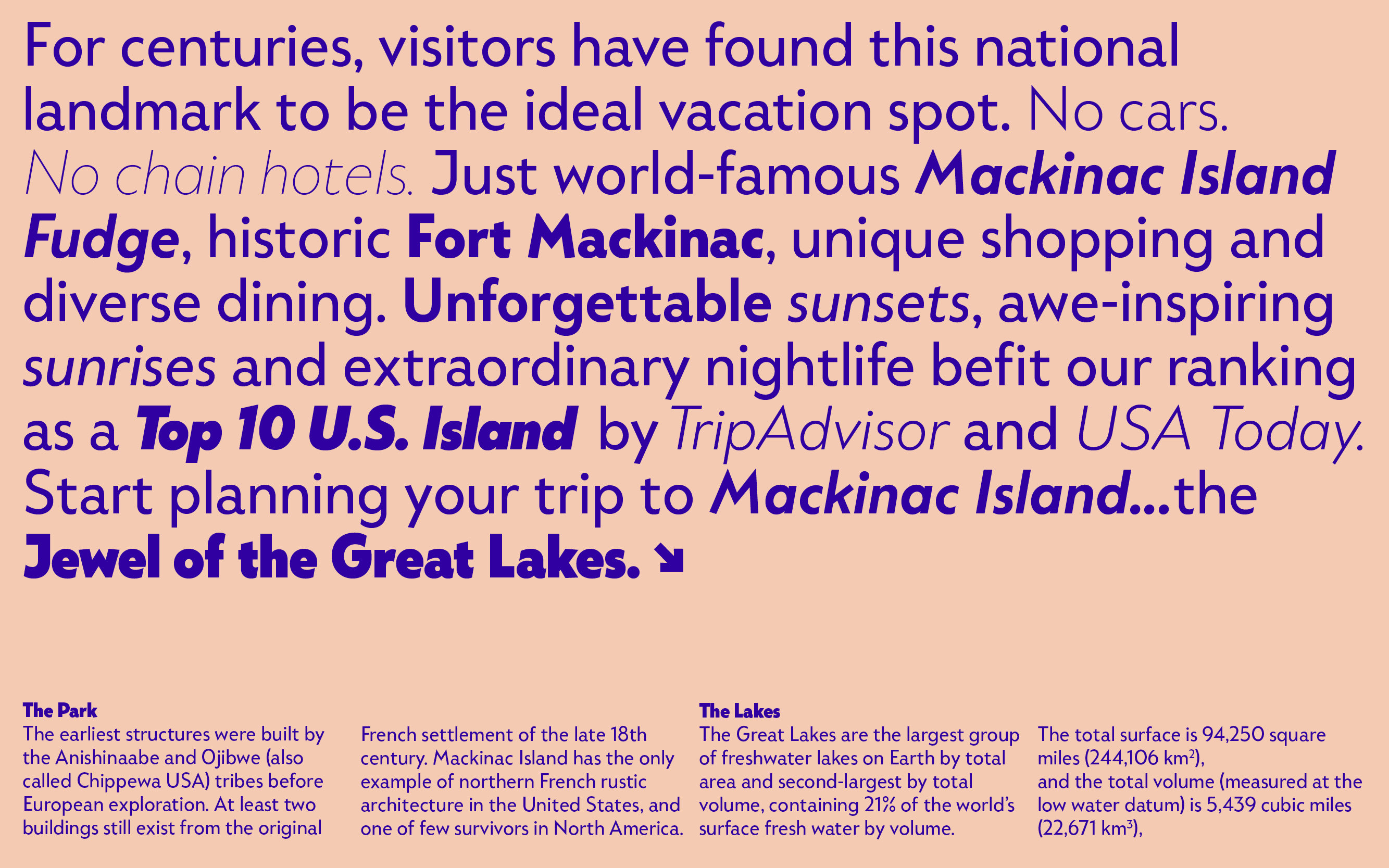 Mack is a humanist sans serif inspired by the natural, brush-made variations of details originally rooted in geometry. The spark for the creation of Mack came from lettering on a map of Mackinac Island whose angled terminals, pointed peaks, and variation of proportion were all details that set it apart from the strictly geometric forms it appears to reference. Rather than copying the few letters there and extrapolating them into a whole font, Mack is an original sans serif design following similar principles. Its structure and contrast resemble those of mid-century geometric typefaces while its curves and terminals are angled to emulate the stroke of a brush.
