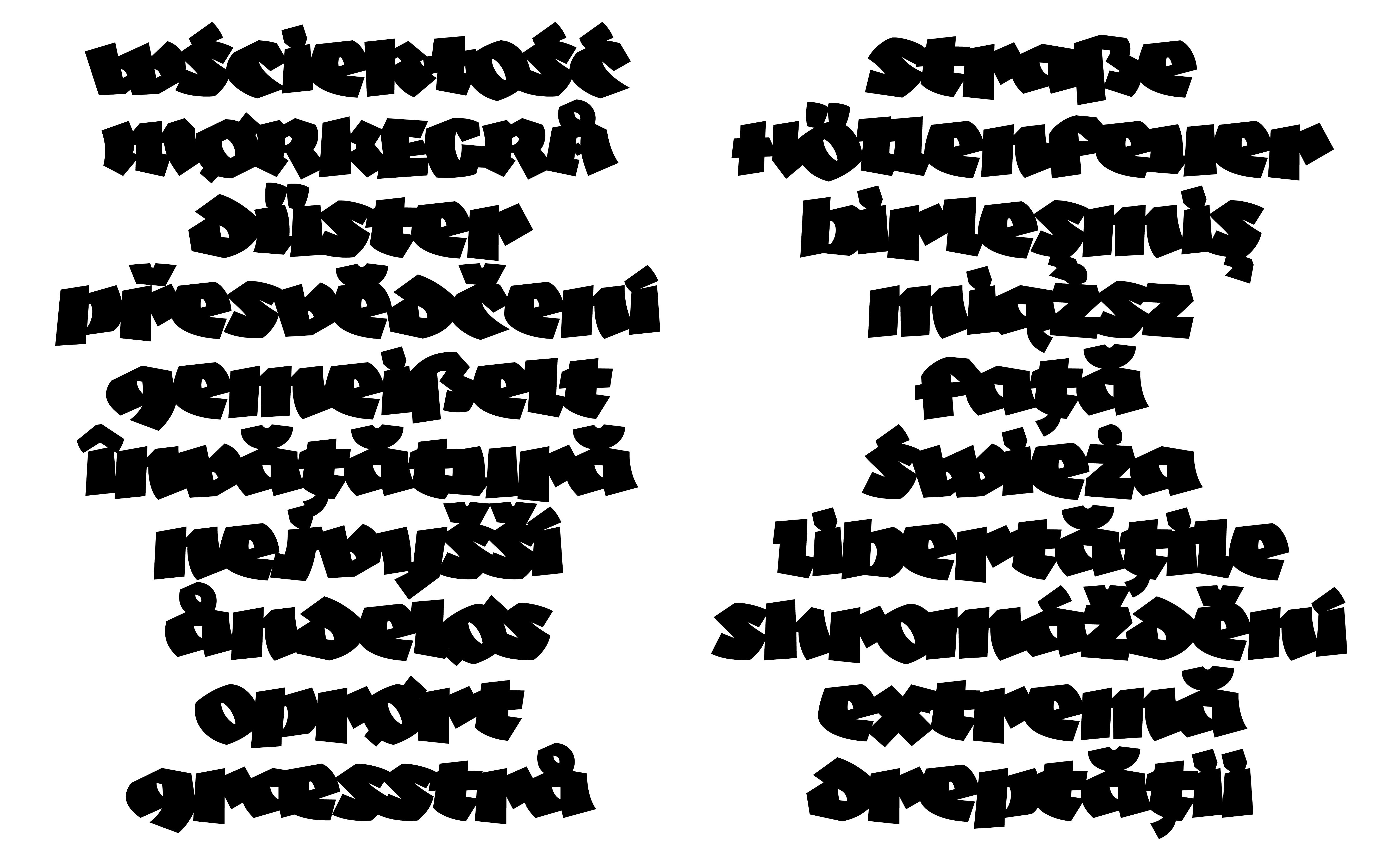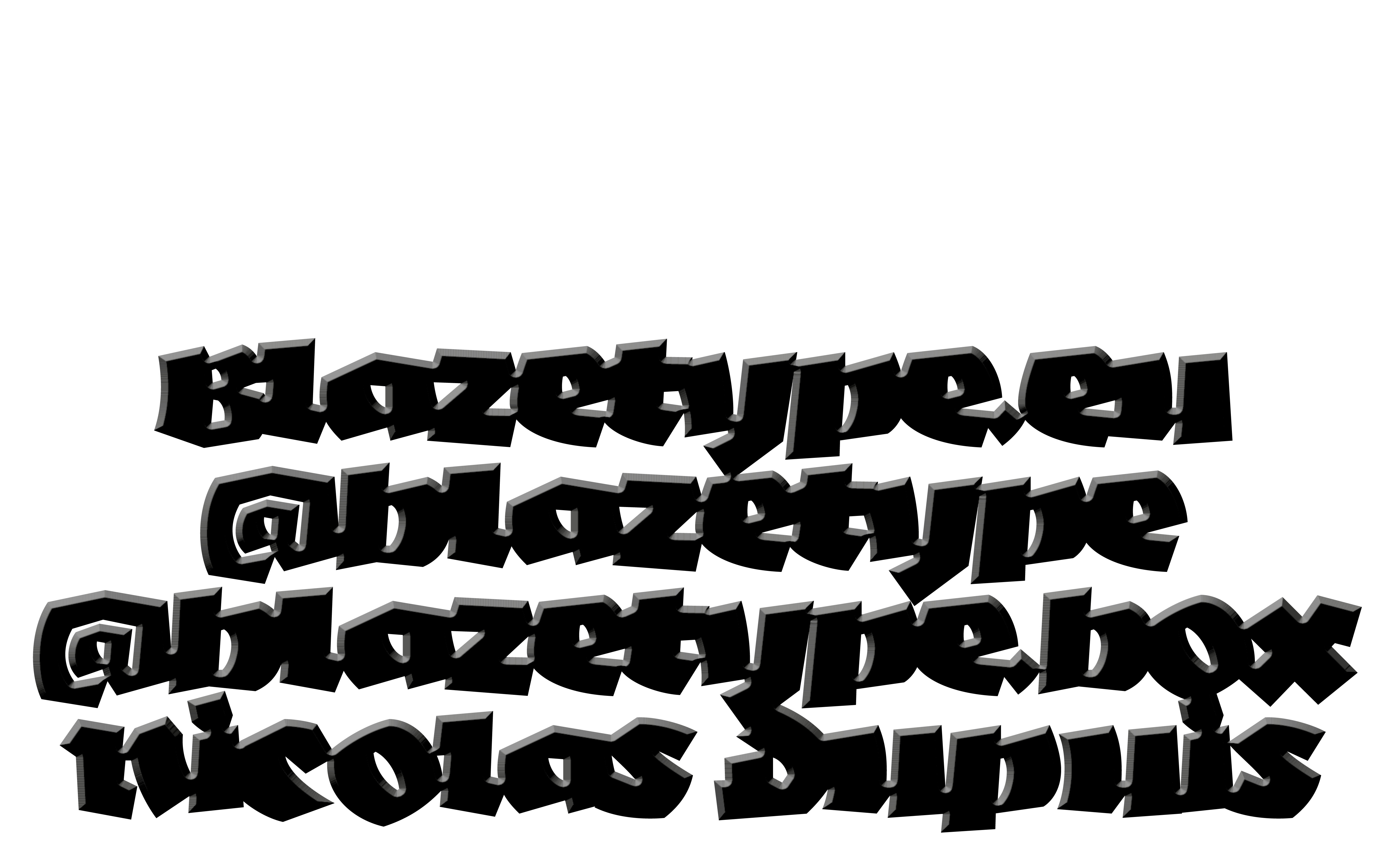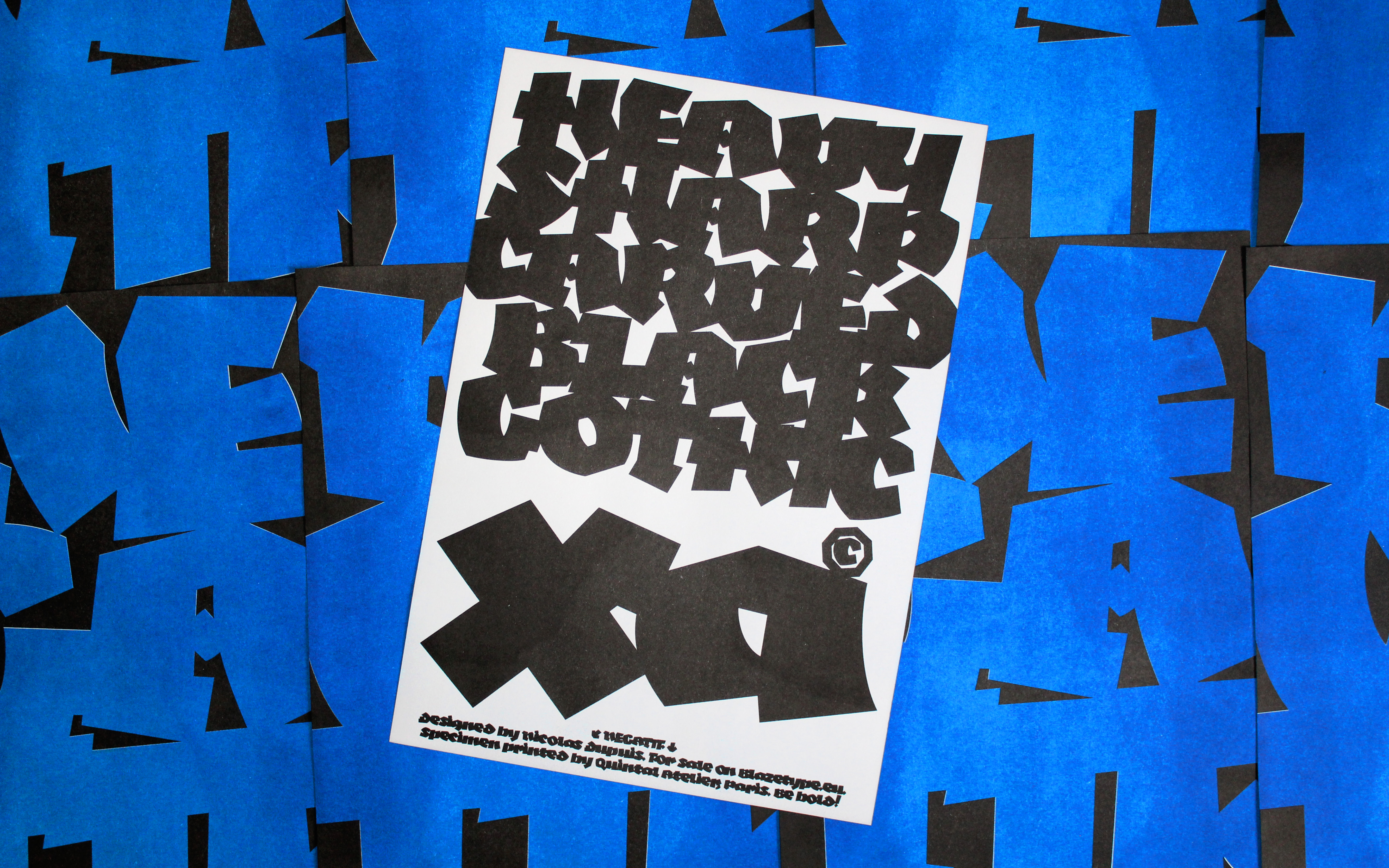 Negatif font comes from an intention to simplify the gothic letter with a unique black style. The letters were first designed with some calligraphic research and then cut out in black paper. With the aim of obtaining raw, incisive, cutting forms. Negatif font consists in carving in the matter as sculpture, retaining the gothic inspiration..