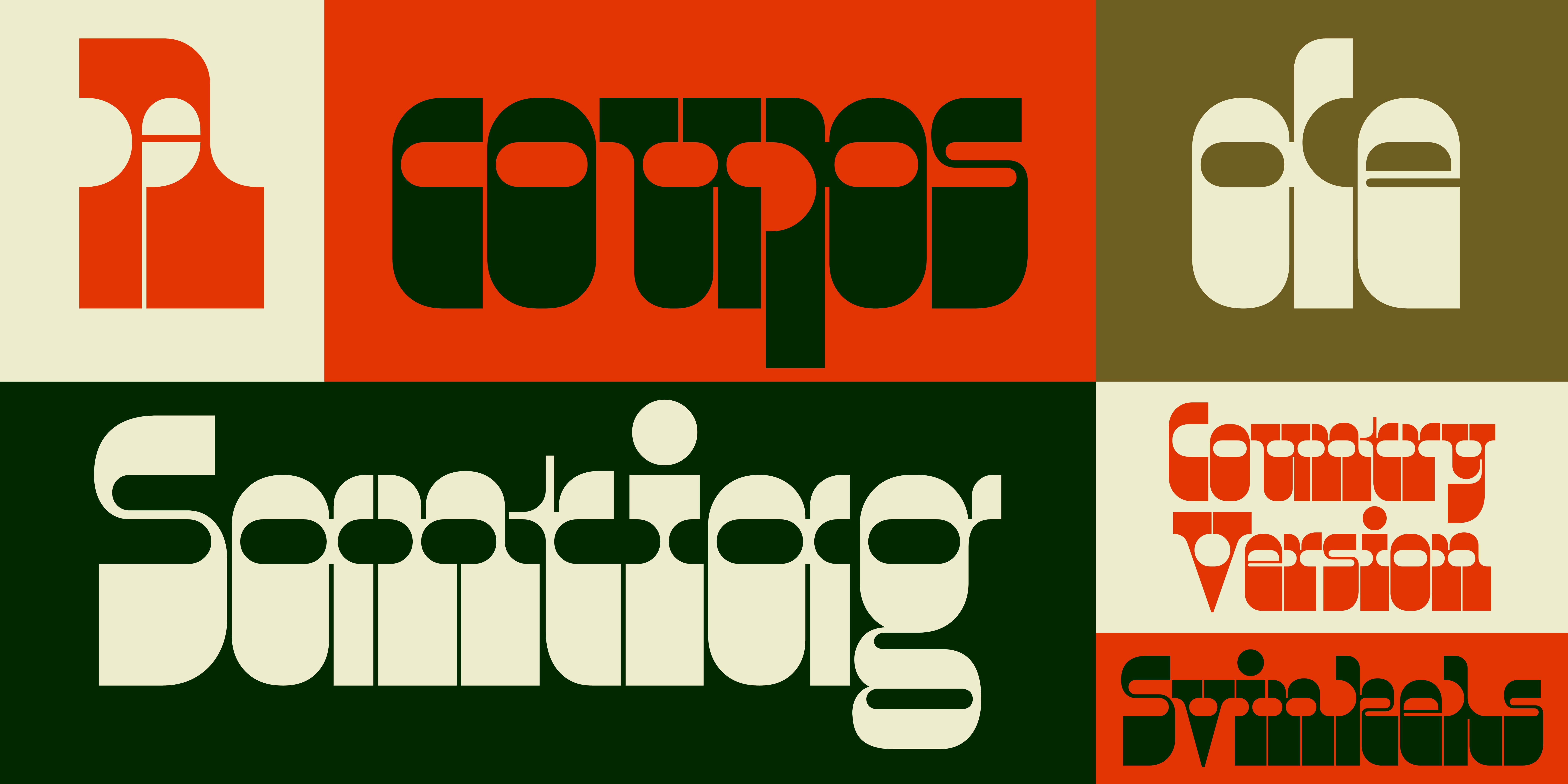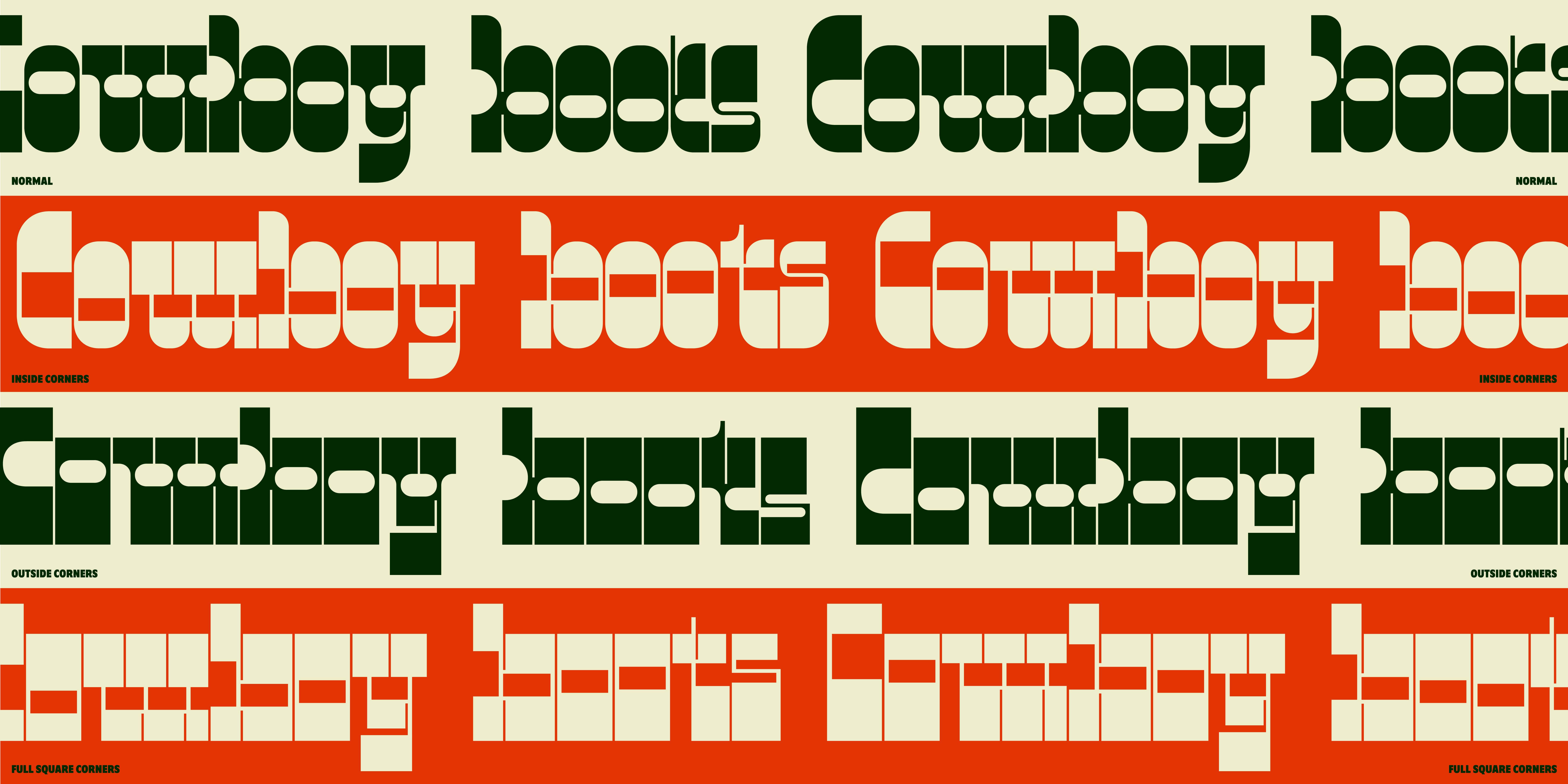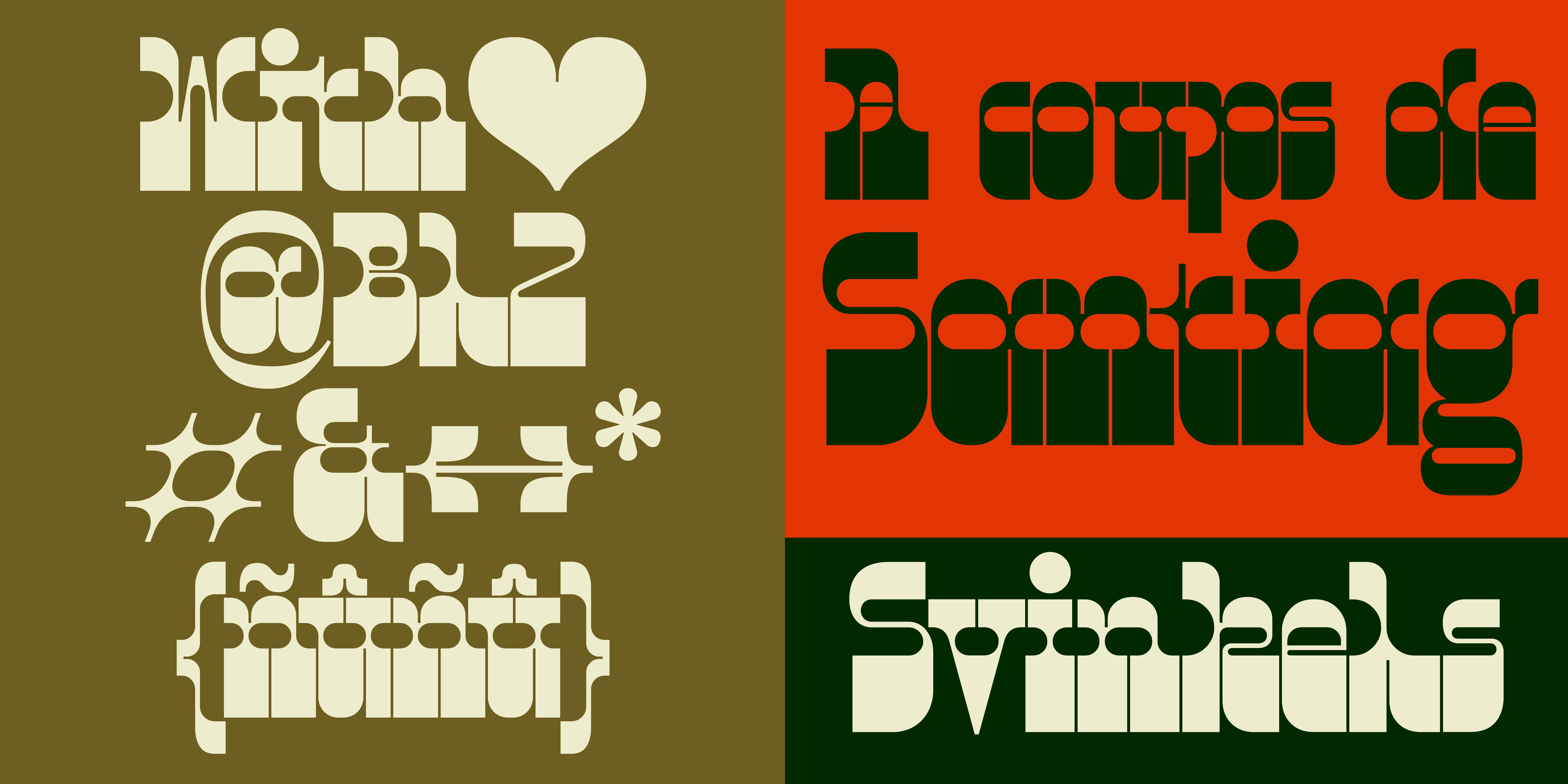 Santiag, designed by Clement Cases, is a contemporary western typeface, inspired by the reversal of stress in the character strokes of the mythic Italian typefaces from the 19th century. This typeface is a modern take on the genre, attempting to incorporate geometric shapes into the counter forms. Featuring bold shapes that relate to serifs, the half-circle is key to creating the rhythm and distinct character of the typeface. The height of the base is adjustable, giving the overall typography a cartoonish feel.