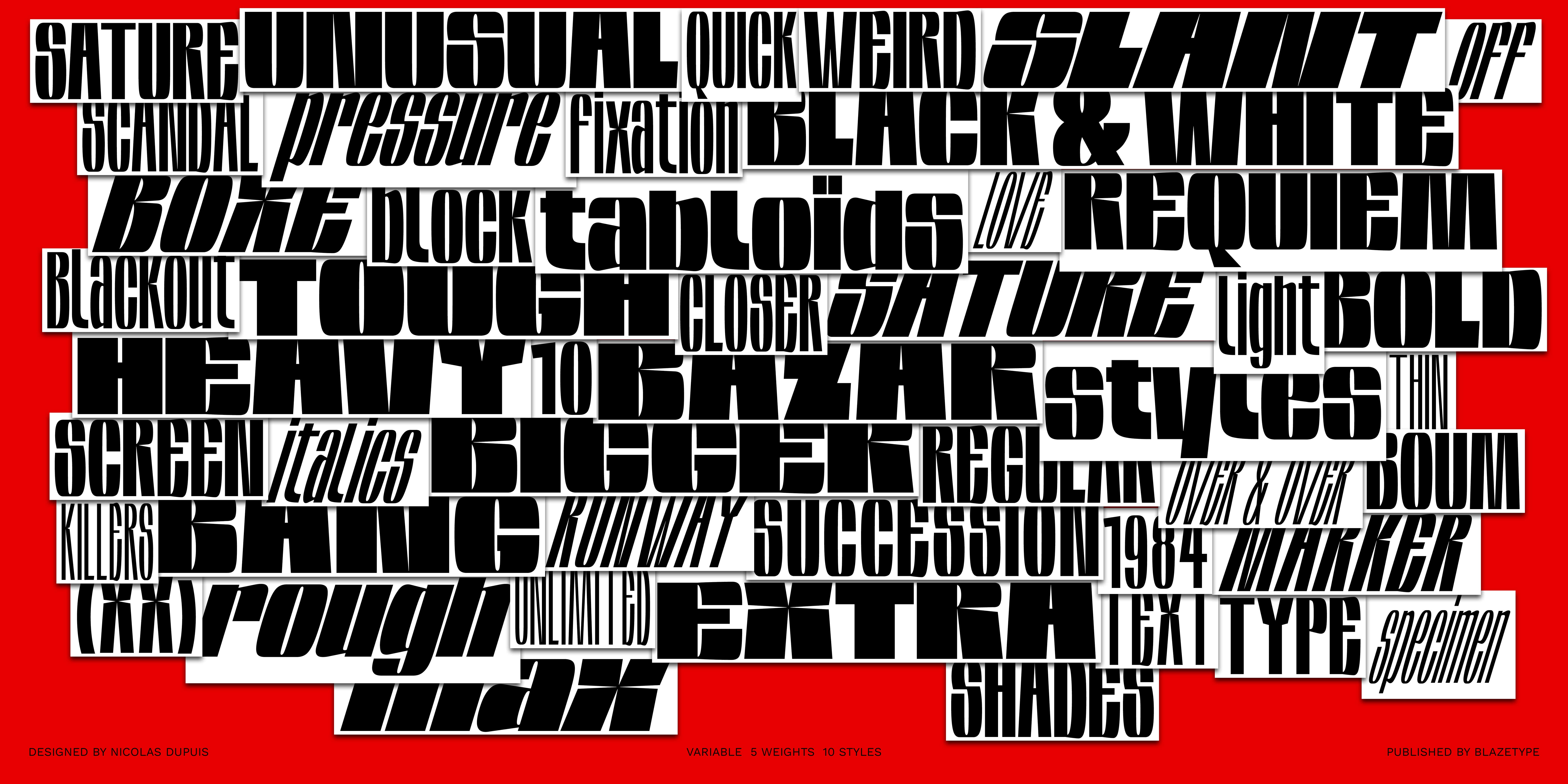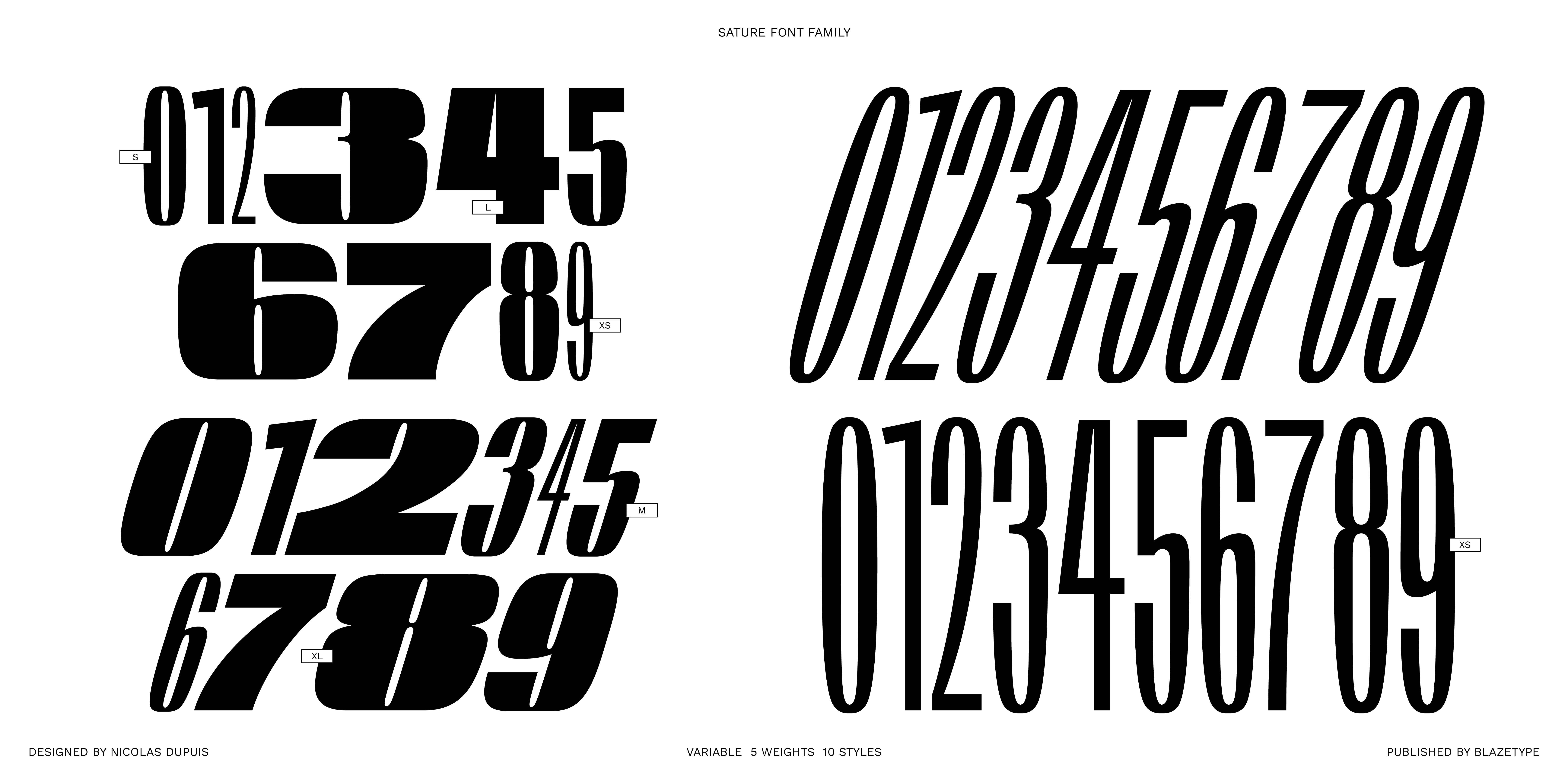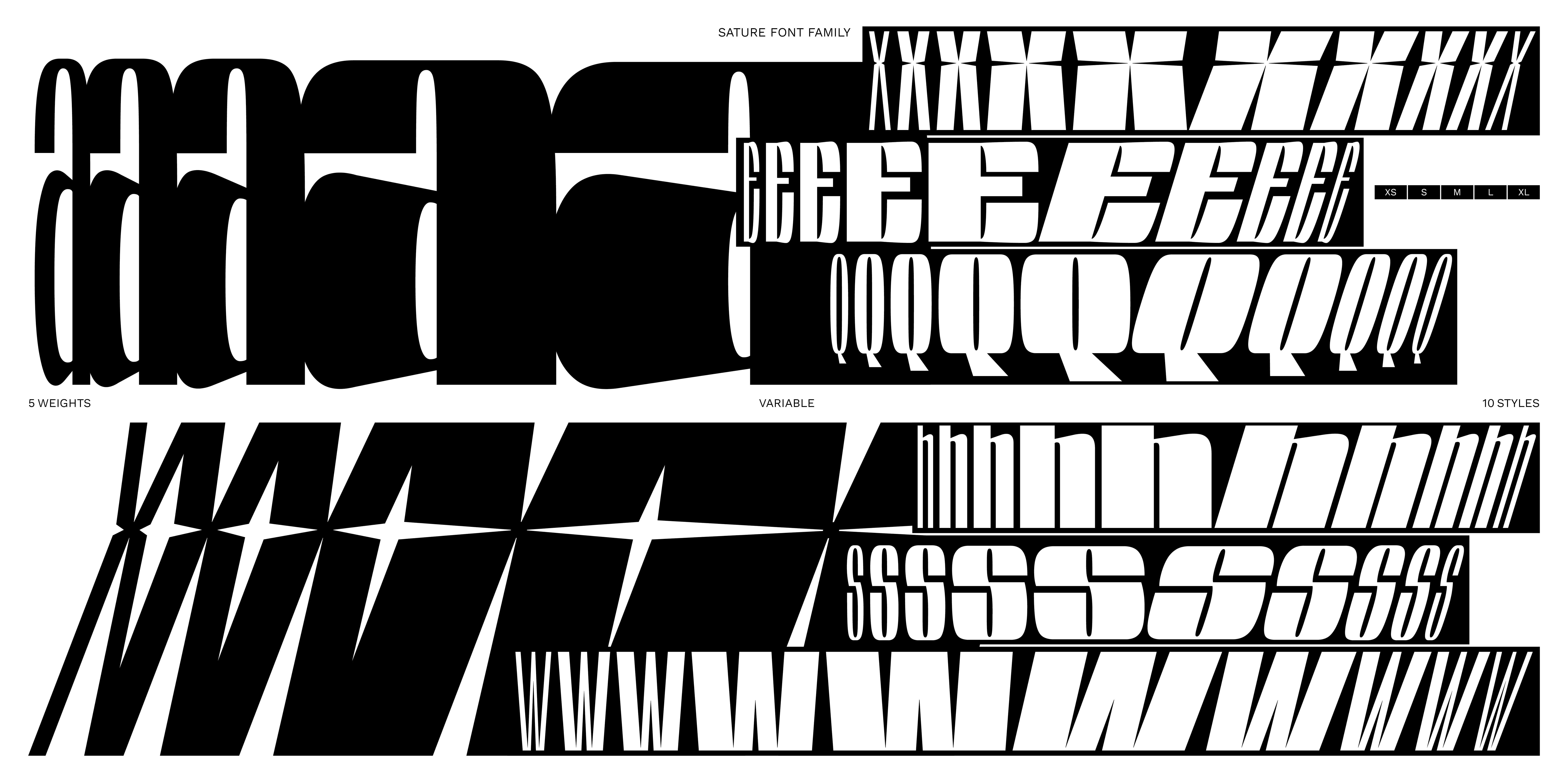 The name of the font comes from the french word «Saturer», meaning to overtake with excess. Feel free to maximise. With its 5 heights and 10 styles with the slant, the family offers a wealth of possibilities for creating saturation effects. A variable font that gives the impression that between each style appears a doubling of the letter, like a felt-tip marker that enlarges the letter. Horizontal processing was carried out to give the letters their fullness, making it easy for use in large sizes and high-impact messages