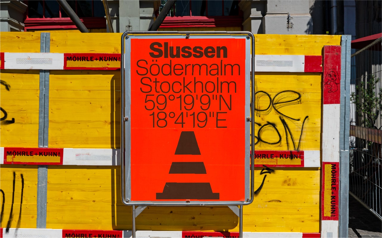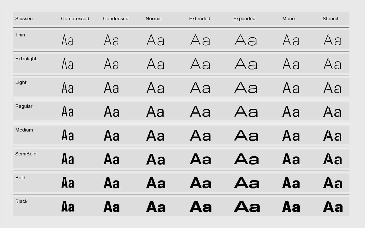 Slussen is a Neo-Grotesque typeface well suited to tech and industrial companies. Slussen's inspiration comes from rhythm and organisation of construction sites. When compared to more conventional Neo-Grotesque typefaces, Slussen's design structure is based on a linear evolution throughout angular outlines. Combined with flat endings and a slight contrast in letterforms, this font family has been designed to cover a very large range of uses, from small captions to huge titles. From Compressed to Expanded, the complete family ranges across 6 widths and 8 weights + matching italics for a total of 104 styles in order to fit all types and sizes of supports, both print and on screen. The family includes a Stencil version in reference to construction sites, ideal for designing signage tools and a Monospace version which combined with the standard version, allows Slussen to be a strong font system.