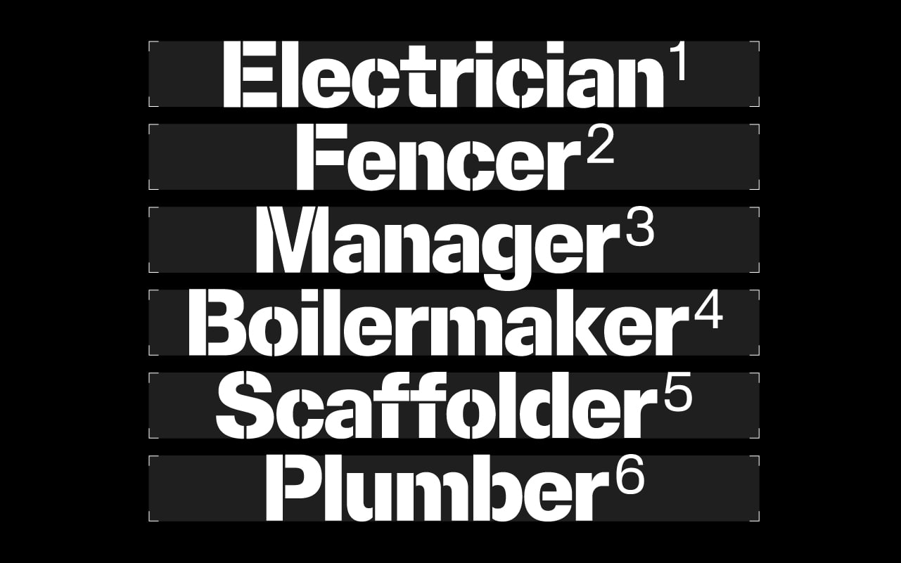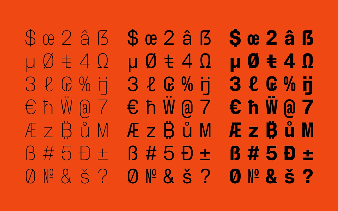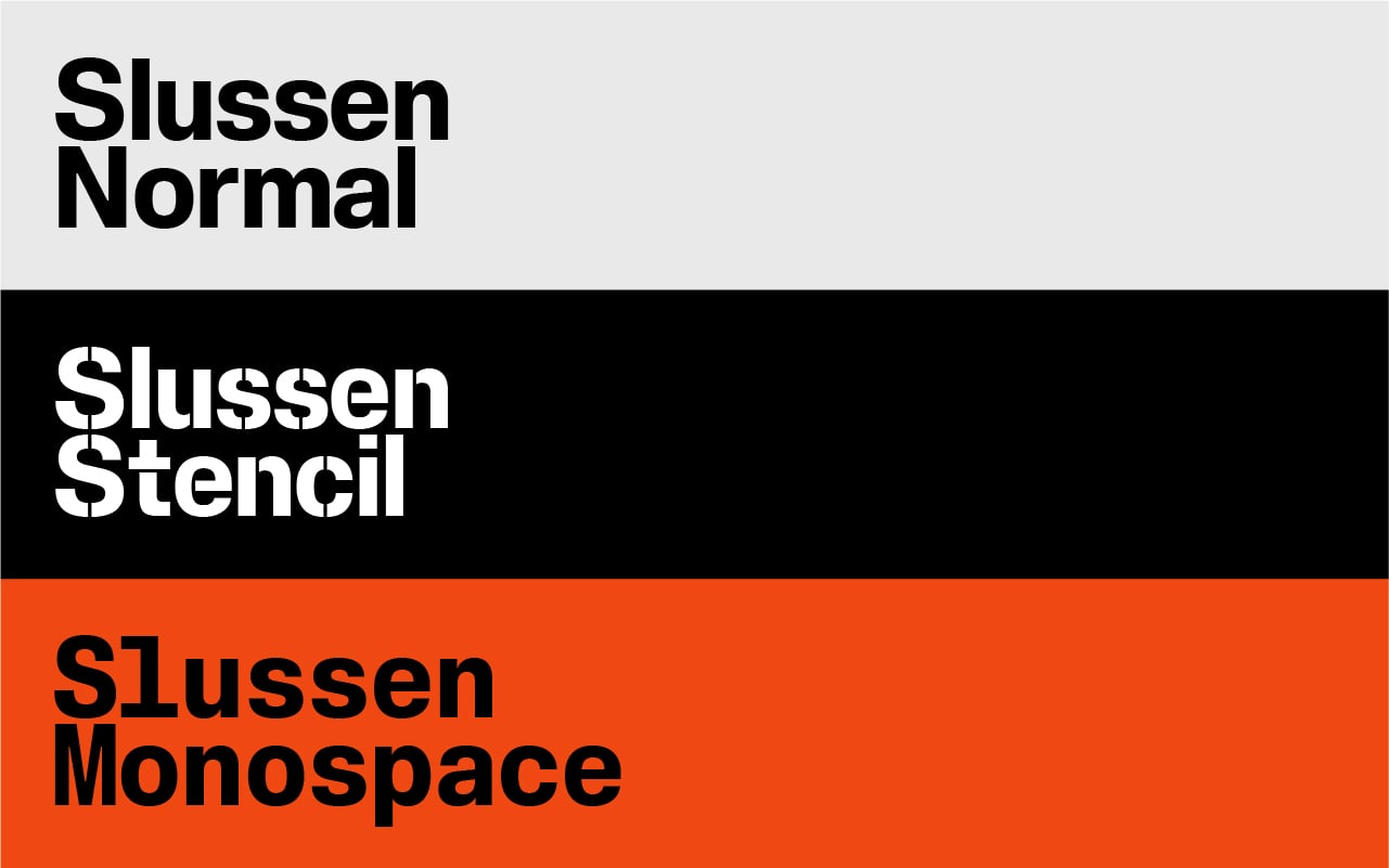 Slussen is a Neo-Grotesque typeface well suited to tech and industrial companies. Slussen's inspiration comes from rhythm and organisation of construction sites. When compared to more conventional Neo-Grotesque typefaces, Slussen's design structure is based on a linear evolution throughout angular outlines. Combined with flat endings and a slight contrast in letterforms, this font family has been designed to cover a very large range of uses, from small captions to huge titles. From Compressed to Expanded, the complete family ranges across 6 widths and 8 weights + matching italics for a total of 104 styles in order to fit all types and sizes of supports, both print and on screen. On top of this Stencil variant, the font family also includes a Monospace version which combined with the standard version, allows Slussen to be a strong font system.